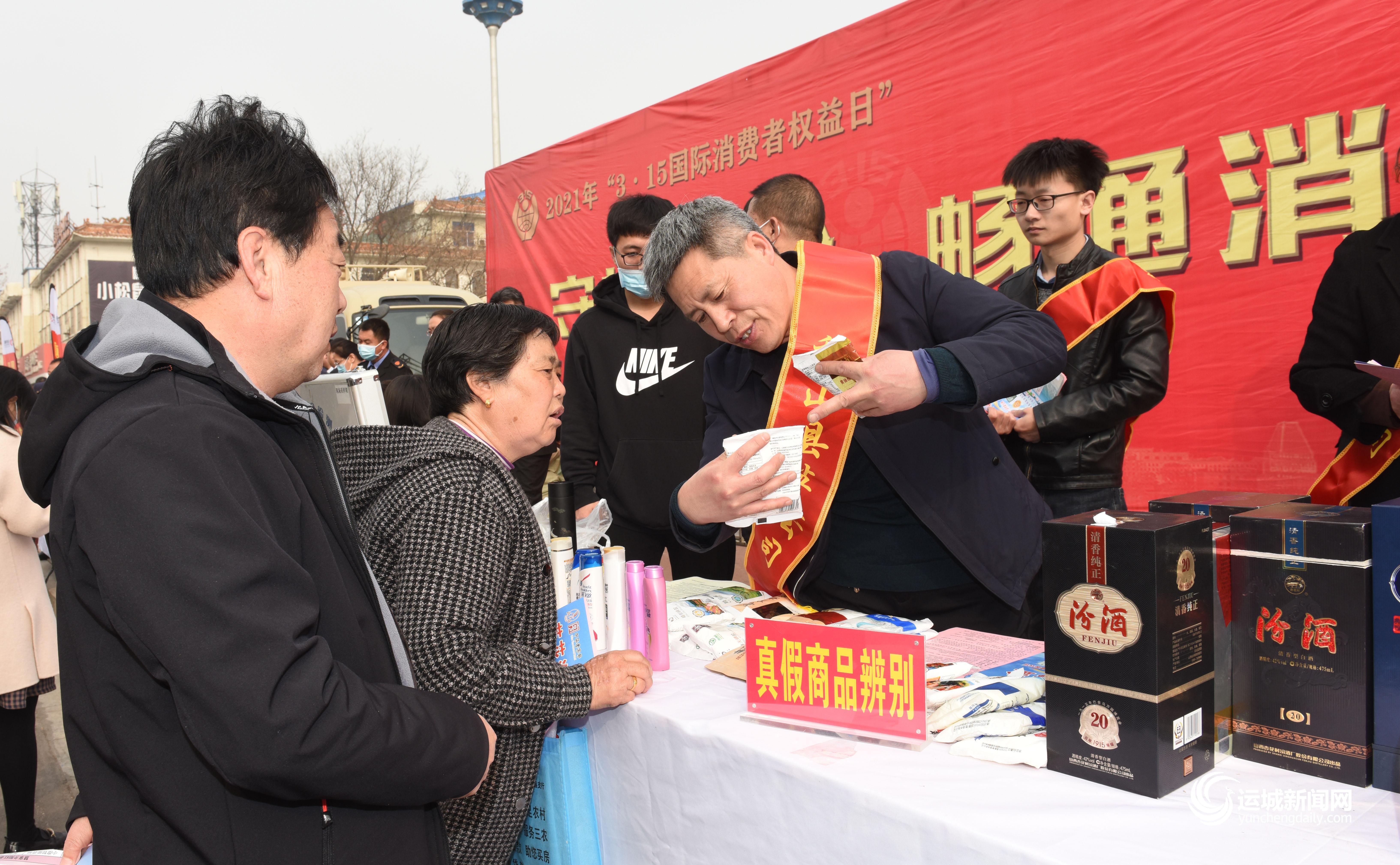 3月15日,在稷山县稷峰文化广场,工作人员在教群众如何辨别真假食盐。 当日,稷山县举行以“守护安全 畅通消费”为主题的3·15“国际消费者权益日”宣传活动。工作人员教市民辨别真假商品,开展法律法规宣传,现场接受消费者的咨询和投诉,营造安全、放心的消费环境。刘冬冬 马敏茜