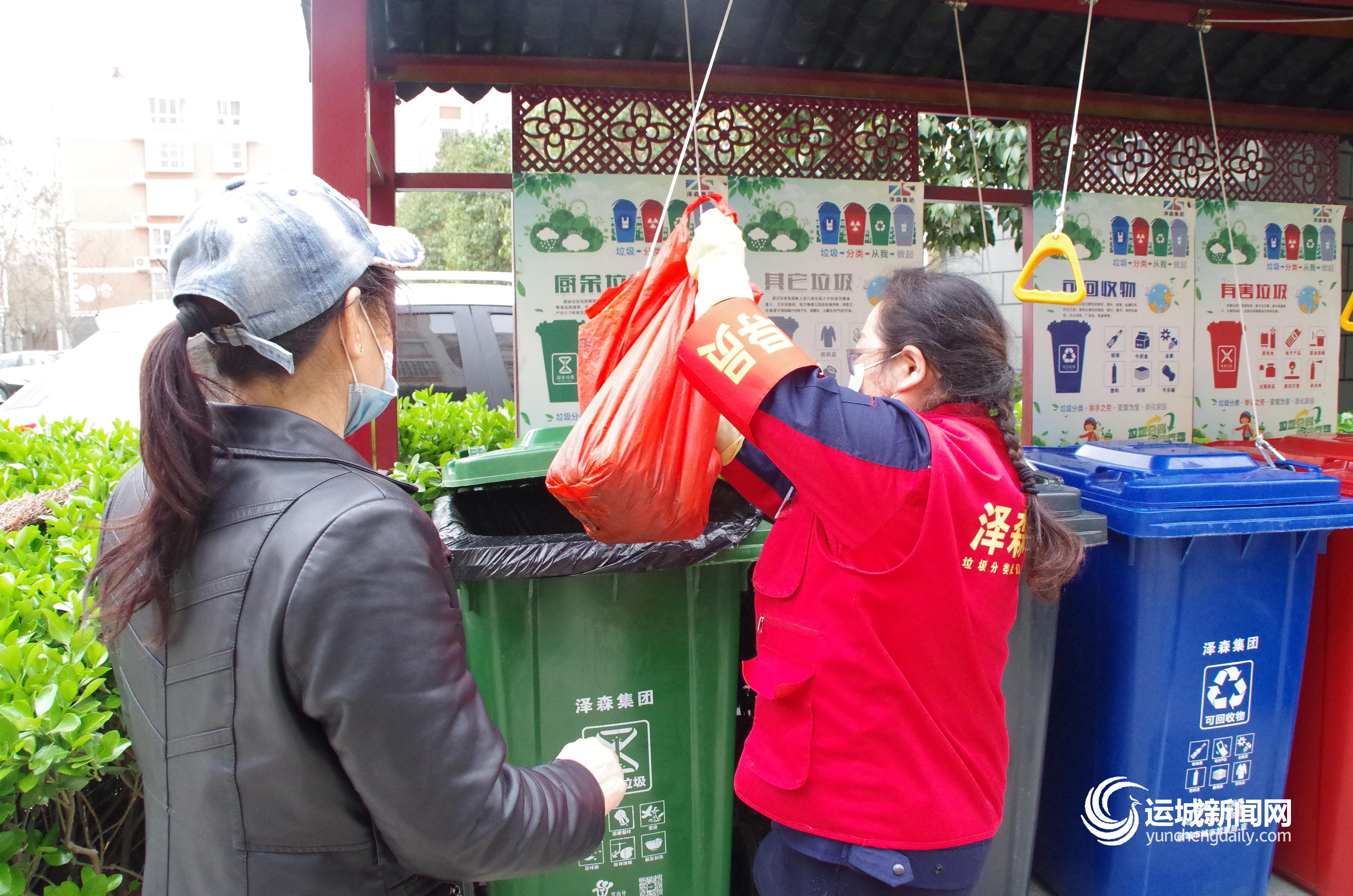 垃圾分类督导员引导市民正确投放垃圾