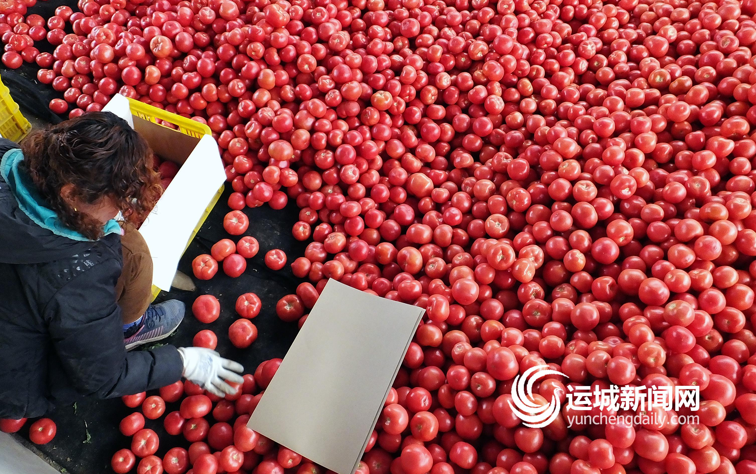 ▲在新绛县泉掌镇王守庄村蔬菜批发市场,菜农在抓紧时间将当日采摘的西红柿装箱外销。