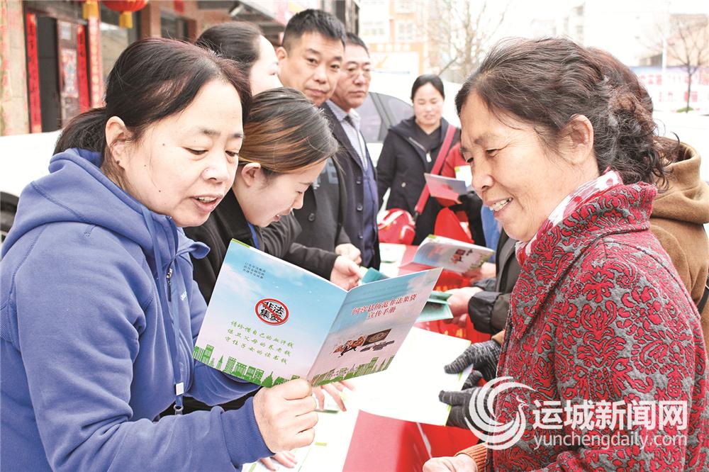 ▲3月21日,闻喜县龙海社区与民生人寿保险股份有限公司闻喜支公司工作人员,向居民宣传打击洗钱、非法集资等有关法律法规。