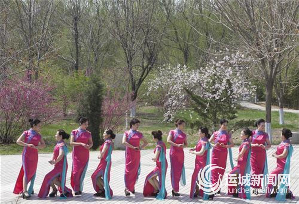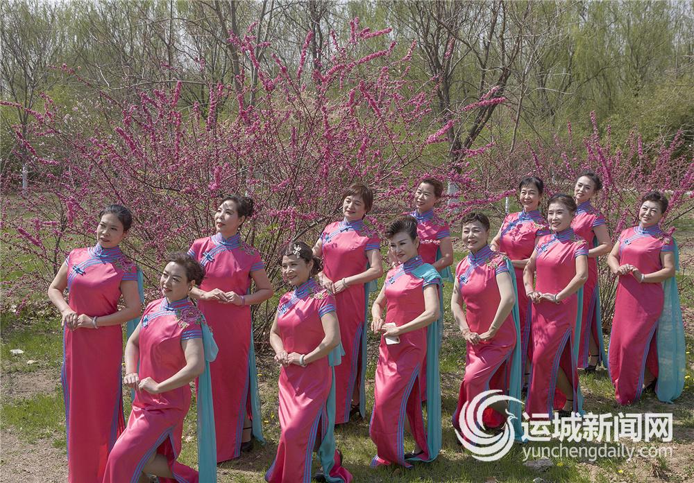 3月22日,运城市群艺馆旗袍协会表演队的成员在舜帝陵公园走秀排练,准备参加乡村桃花节表演。