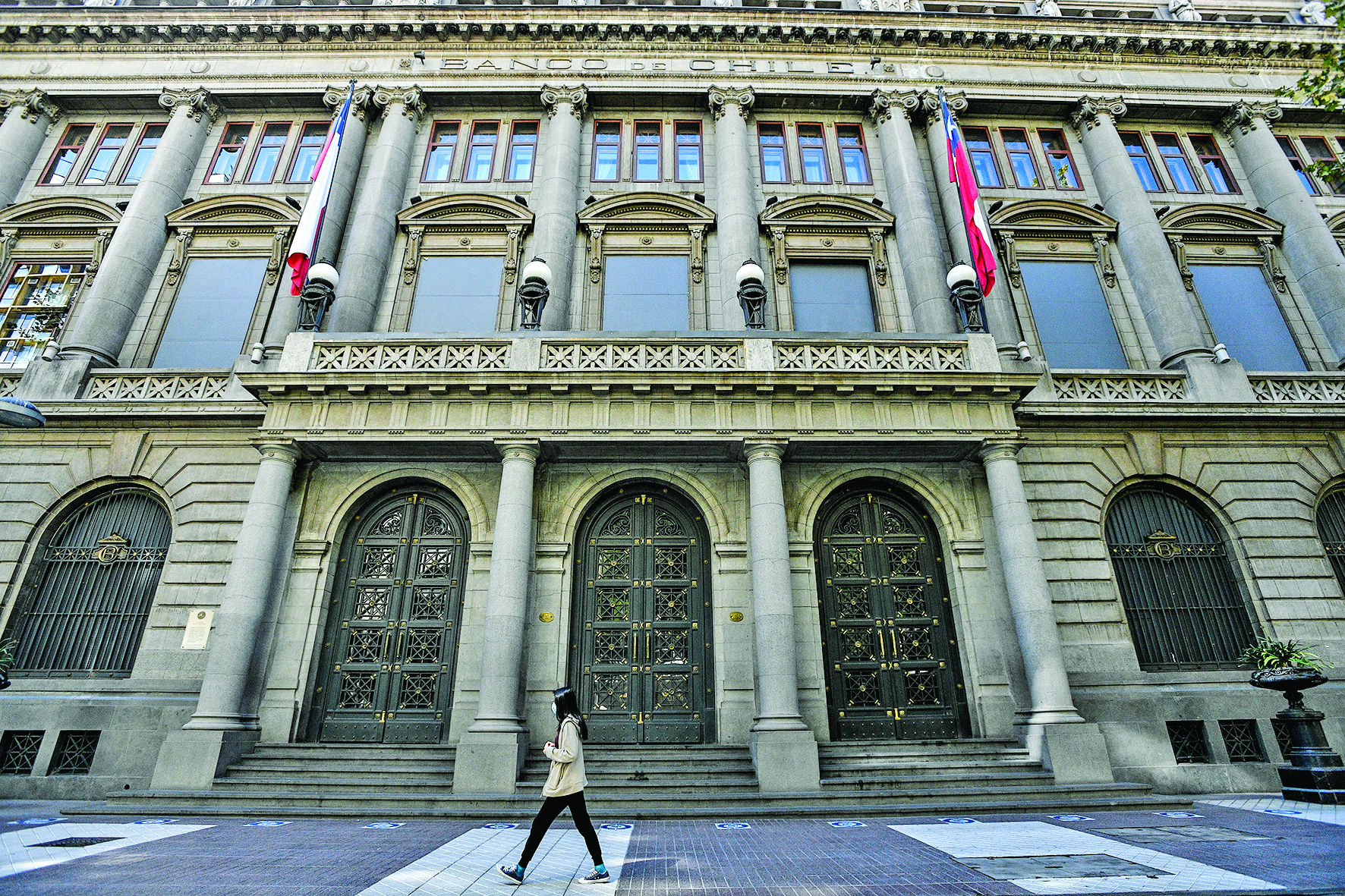 3月27日,在智利圣地亚哥,一名行人经过一家大门紧闭的银行。由于新冠疫情反弹严重,单日新增确诊病例屡创新高,智利政府27日起扩大“封城”范围,受影响人口增至1600万,超全国人口的80%。这是去年3月智利暴发疫情以来“封城”措施波及面最广的一次。