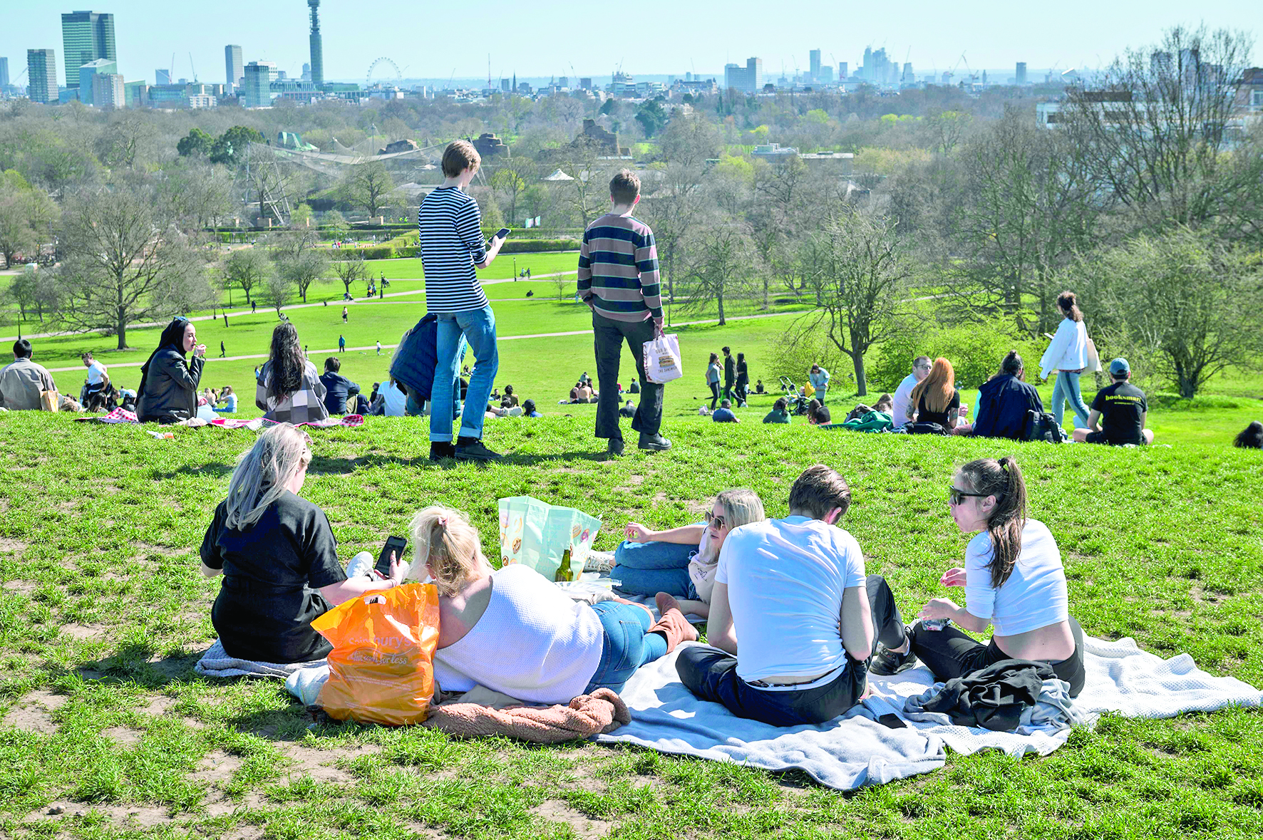 ▲3月29日,人们在英国伦敦的报春花山享受阳光。