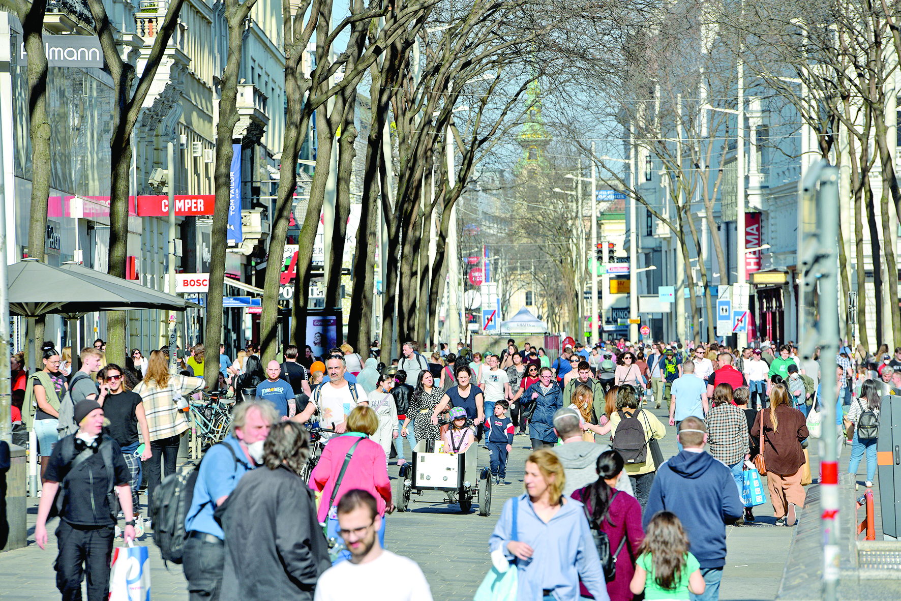 3月31日,市民走在奥地利维也纳玛利亚希尔夫购物街上。奥地利首都维也纳从4月1日至11日采取封禁措施,其中包括关闭零售业商店等,不少民众选择在封禁前一日外出购物。 本栏均据新华社