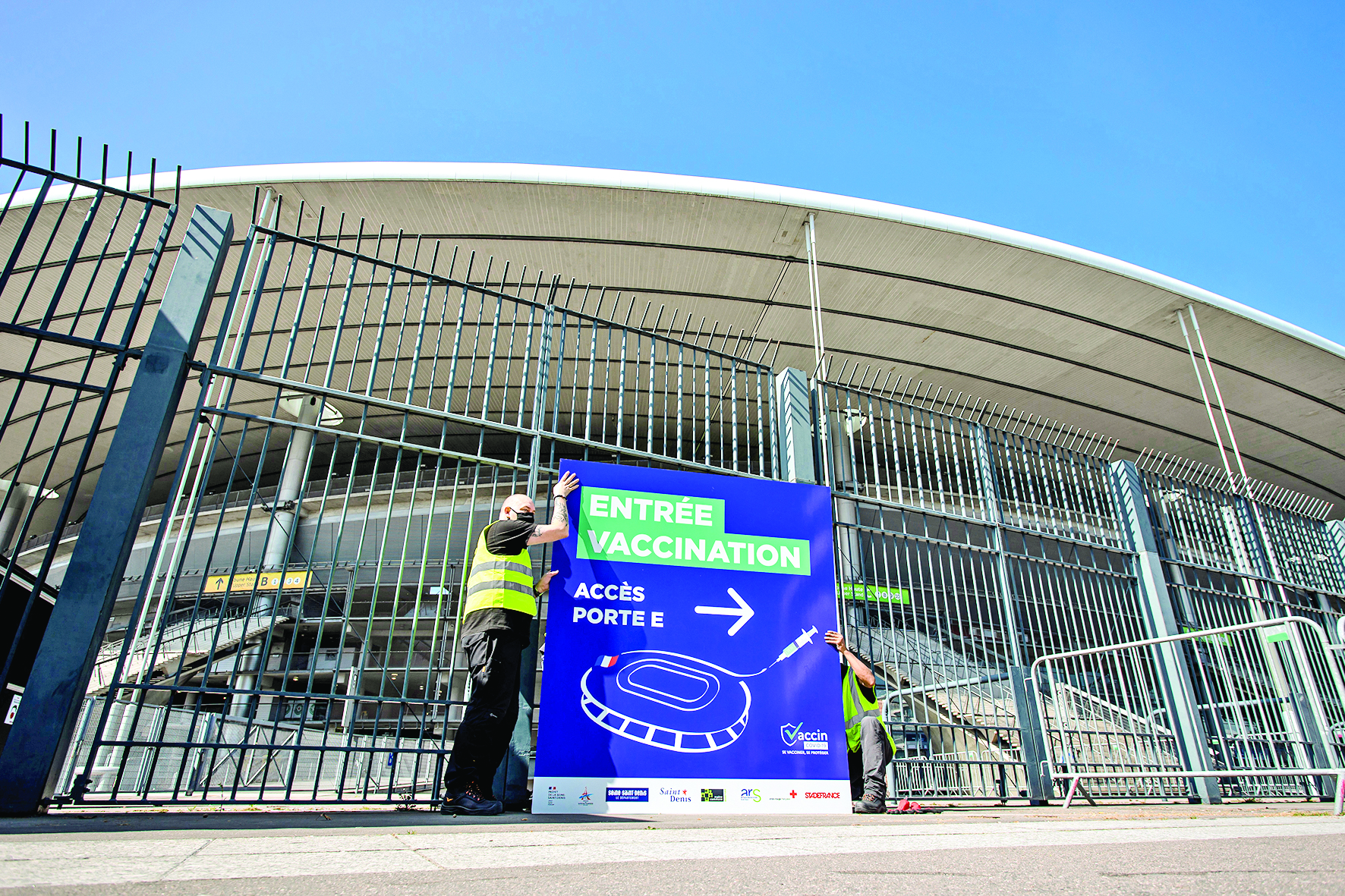 3月31日,工作人员在法国巴黎附近圣丹尼的法兰西体育场外竖立接种新冠疫苗的标识牌。1998年世界杯足球赛决赛场地——法兰西体育场将于4月6日开始为公众接种疫苗。