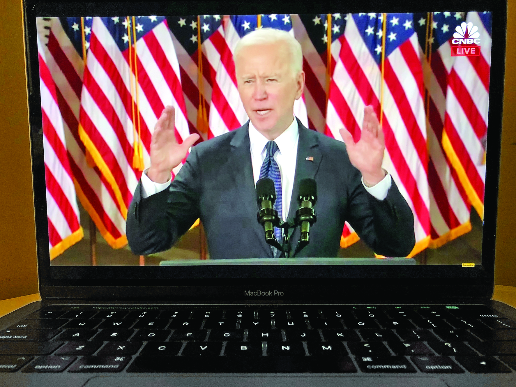 3月31日拍摄的视频直播画面显示,美国总统拜登在宾夕法尼亚州匹兹堡市发表讲话。美国总统拜登31日宣布一项总额约2.25万亿美元的基础设施建设一揽子计划,并表示希望国会今年夏天批准该计划。