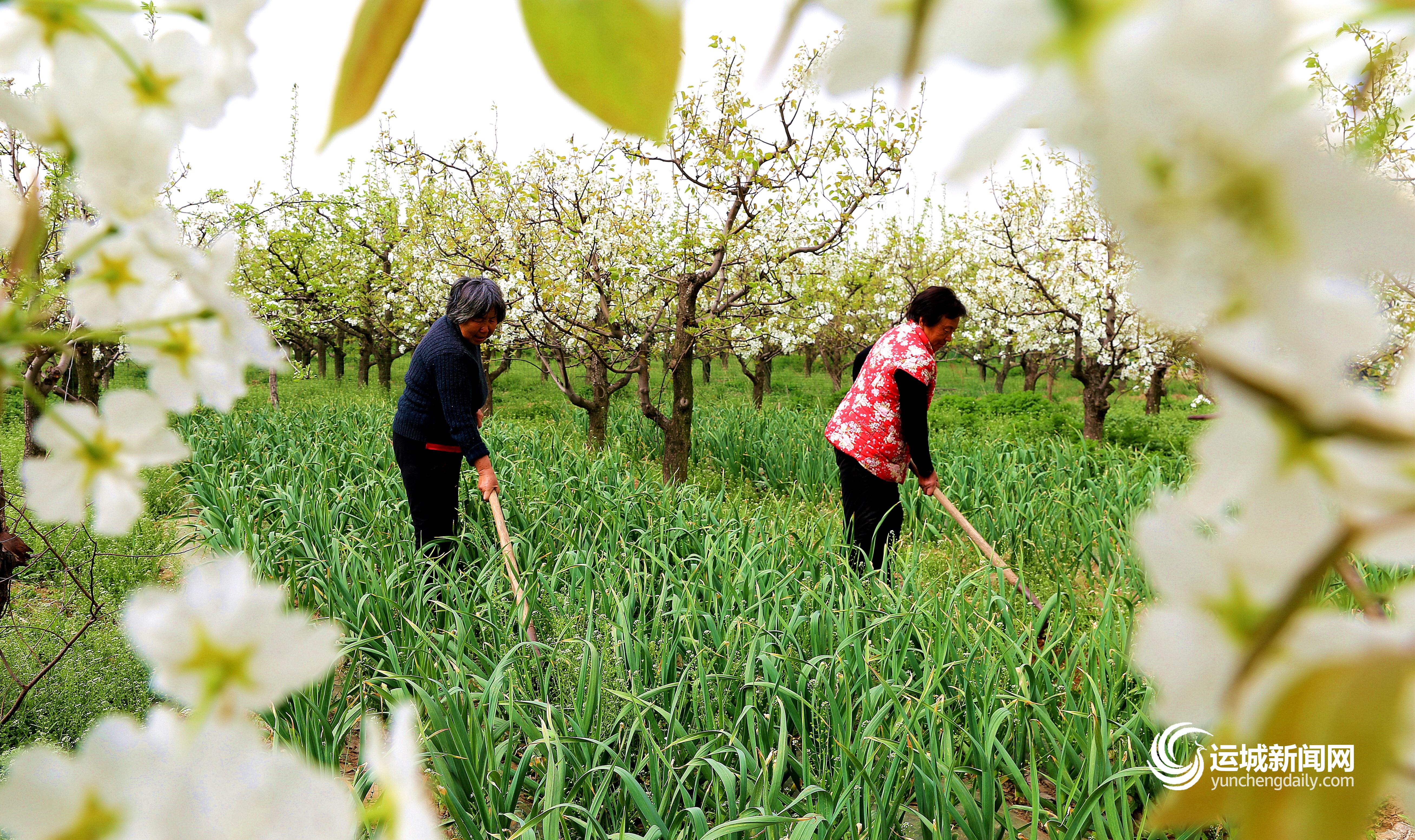 图为3月31日,合作社社员在梨树园里给间作的大蒜除草。