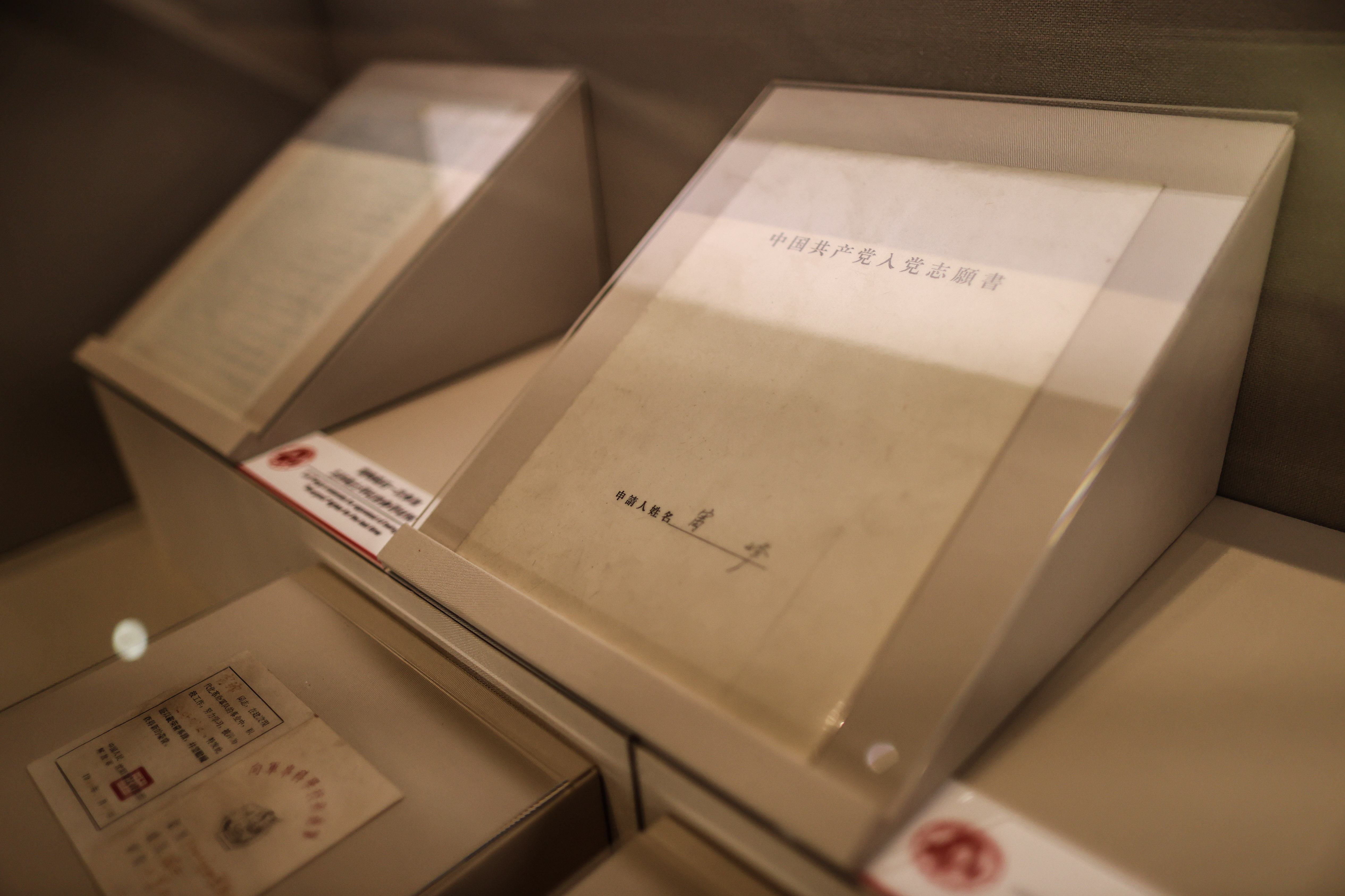 在辽宁省抚顺市雷锋纪念馆,展台上展示着雷锋当年的入党志愿书(3月18日摄)。