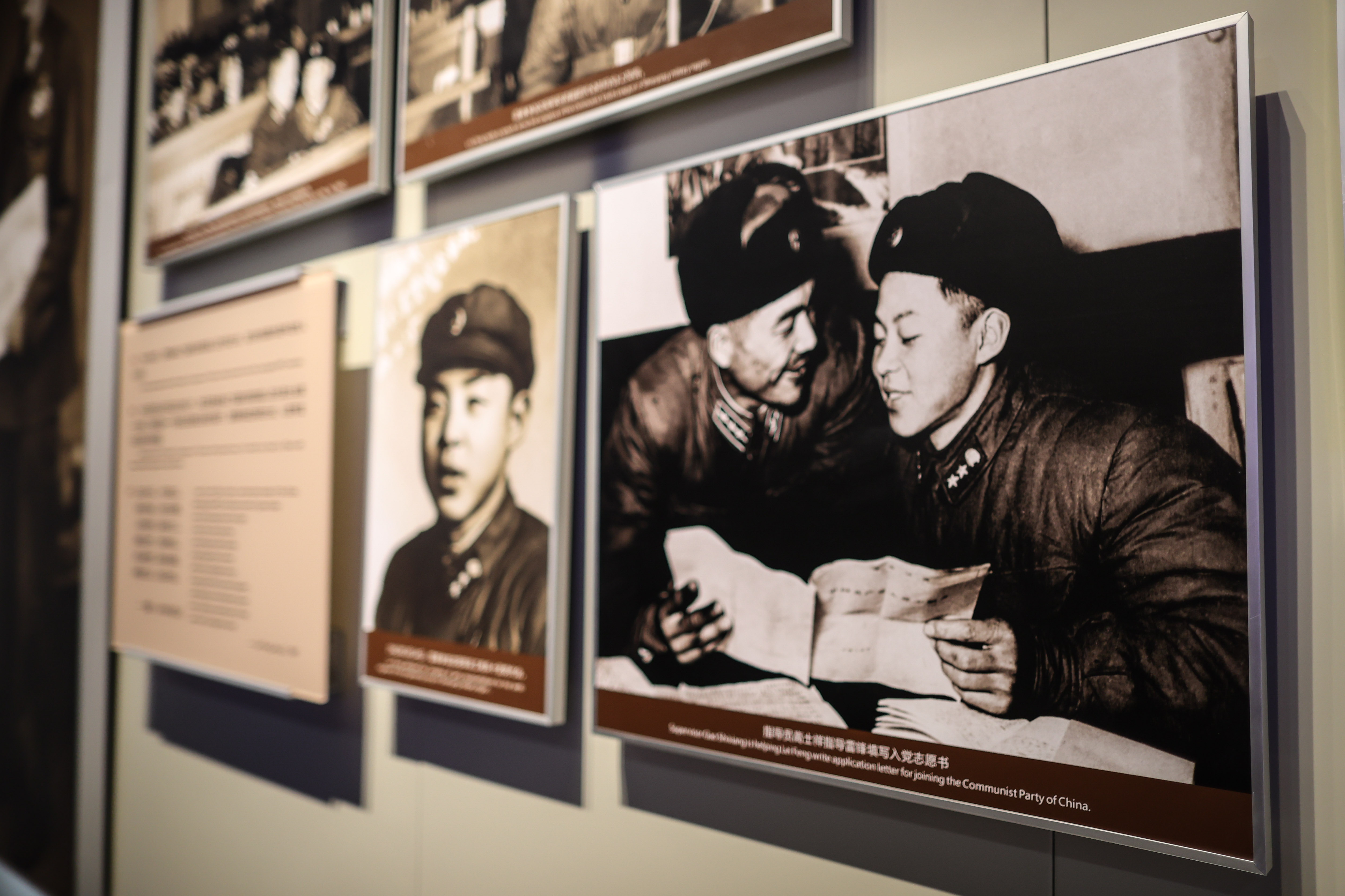 在13号车不远处,有这样一幅照片:雷锋穿着整齐军装坐在案前,身旁的指导员高士祥侧身望向他,两人一起拿着一份中国共产党入党志愿书。