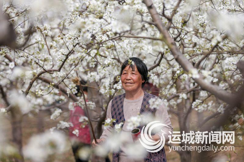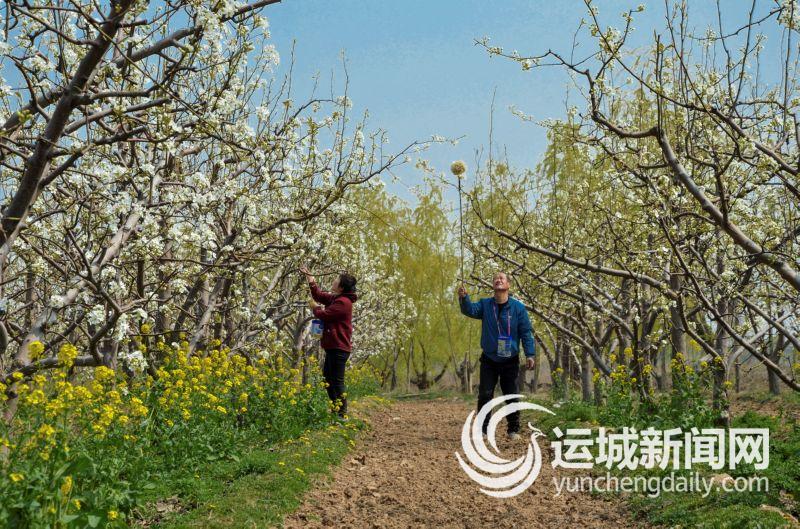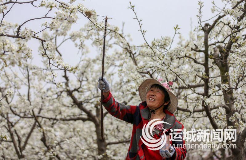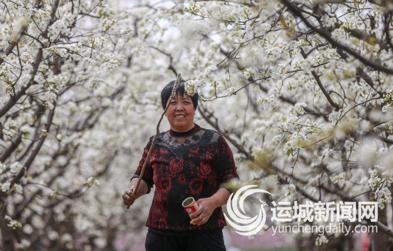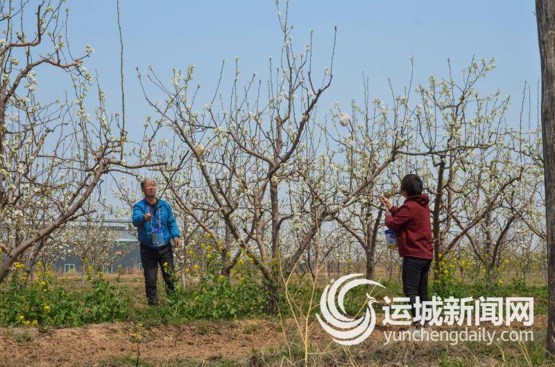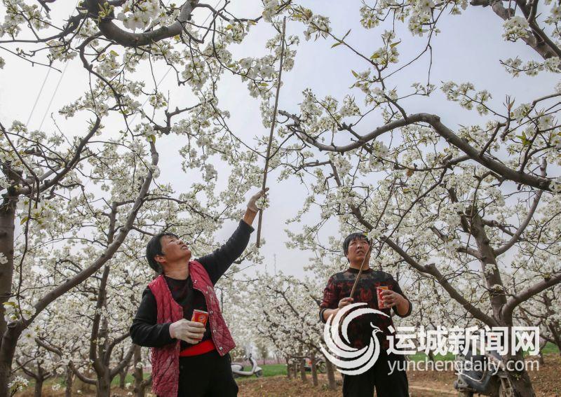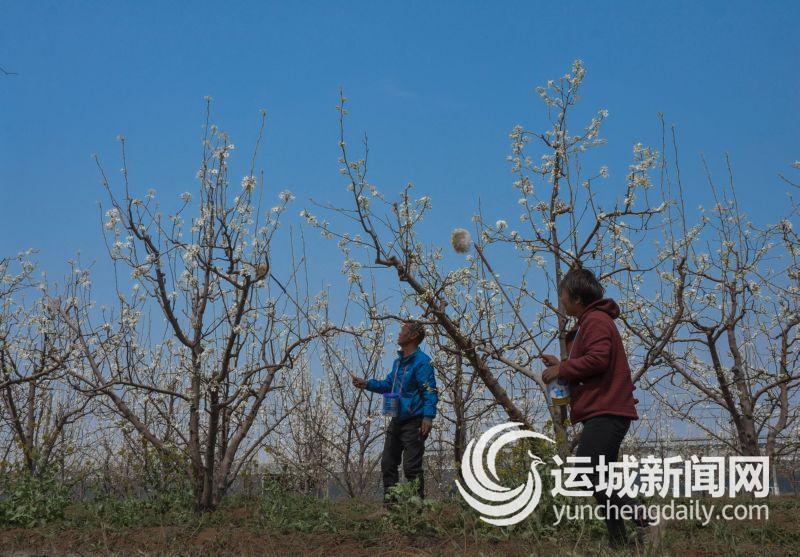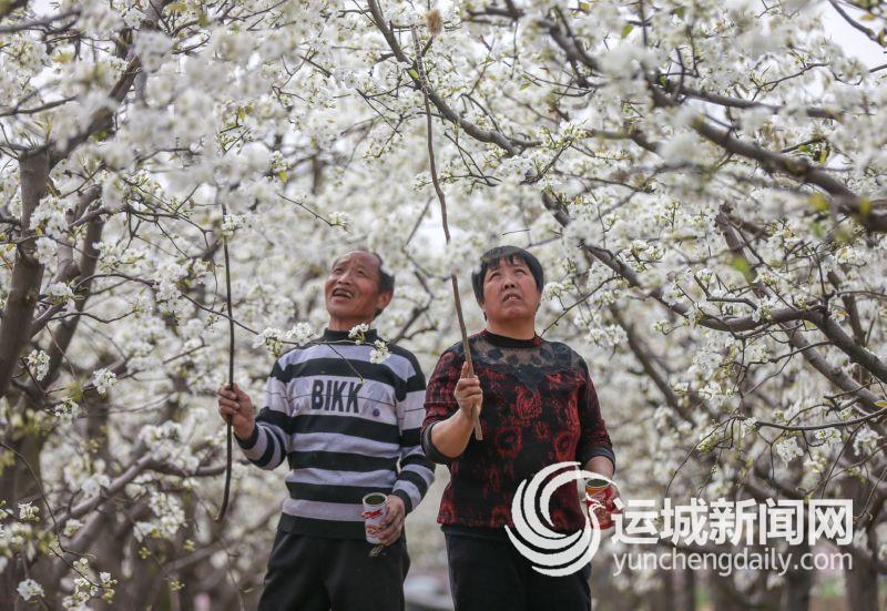 3月30日,稷山县清河镇薛村薛建峰家的3亩梨花盛开,工人们正忙着在梨园里授粉。 特约摄影 史云平