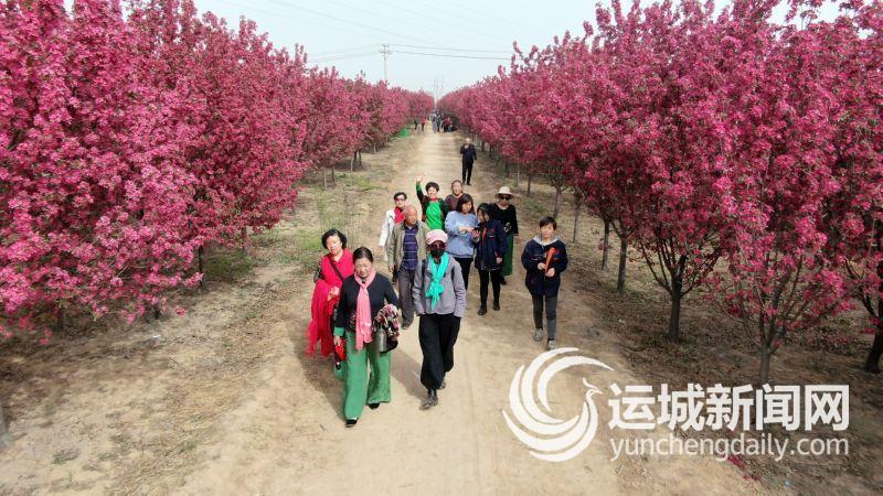 3月28日,游客在河津市僧楼镇南方平村海棠花园里游玩。