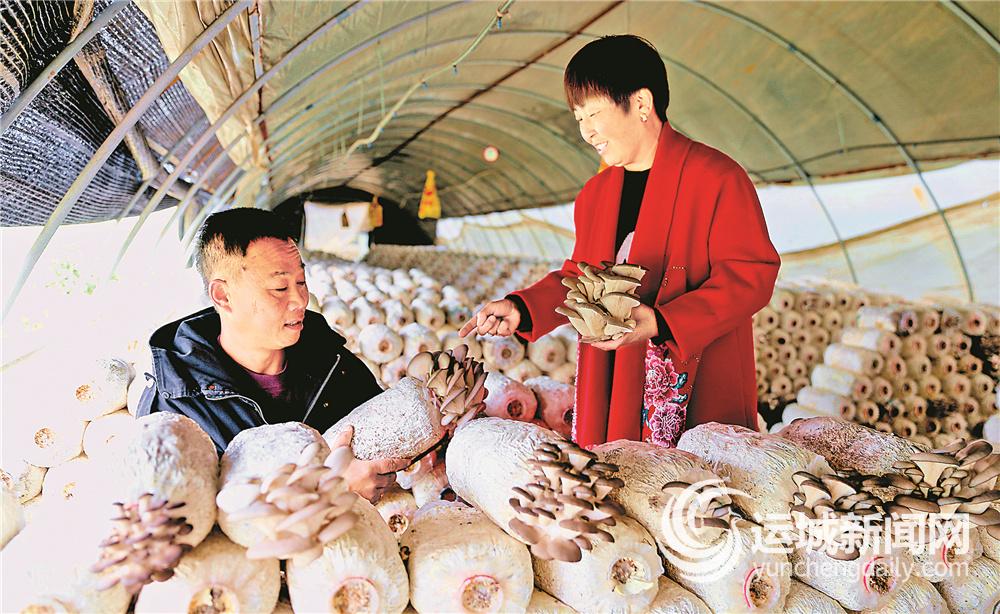 4月5日,夏县尉郭乡西阴村村民樊文辉和妻子在菇棚里观察蘑菇长势。
