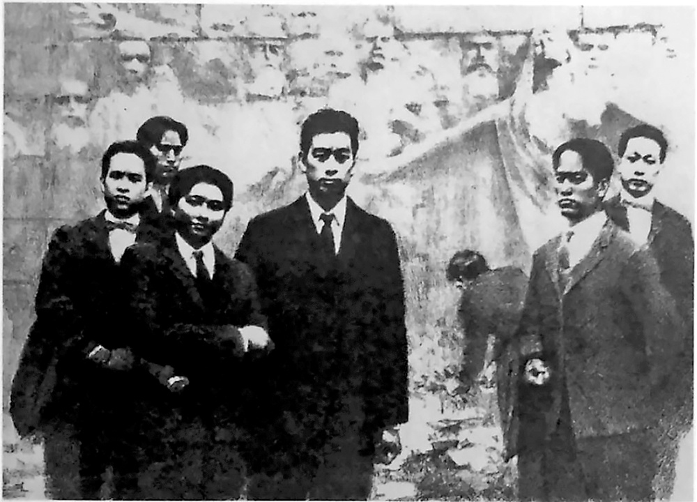 文国璋放弃了得心应手的油画方式,却以并不熟悉的石版画作为创作手段,这是由石版画的材质特点所决定的。石材所特有的层次感和颗粒感能够将一群革命志士的精神面貌展现得非常富有张力和感染力。作者文国璋先生十分高明的地方就在于,画作的主体人群背后增加了一个正在默默献花的人的背影形象为背景,这个背影既象征着旅欧进步青年整