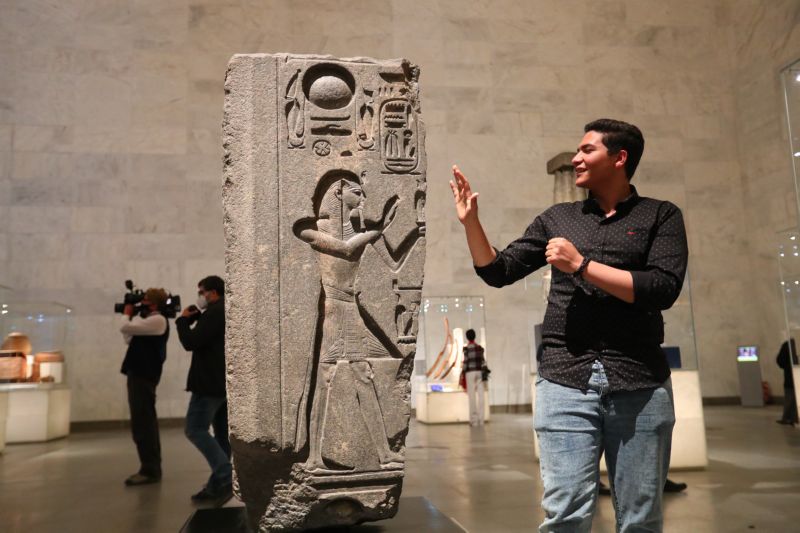 ▲4月4日,在位于埃及首都开罗的埃及文明博物馆,参观者和一座石碑雕刻合影。