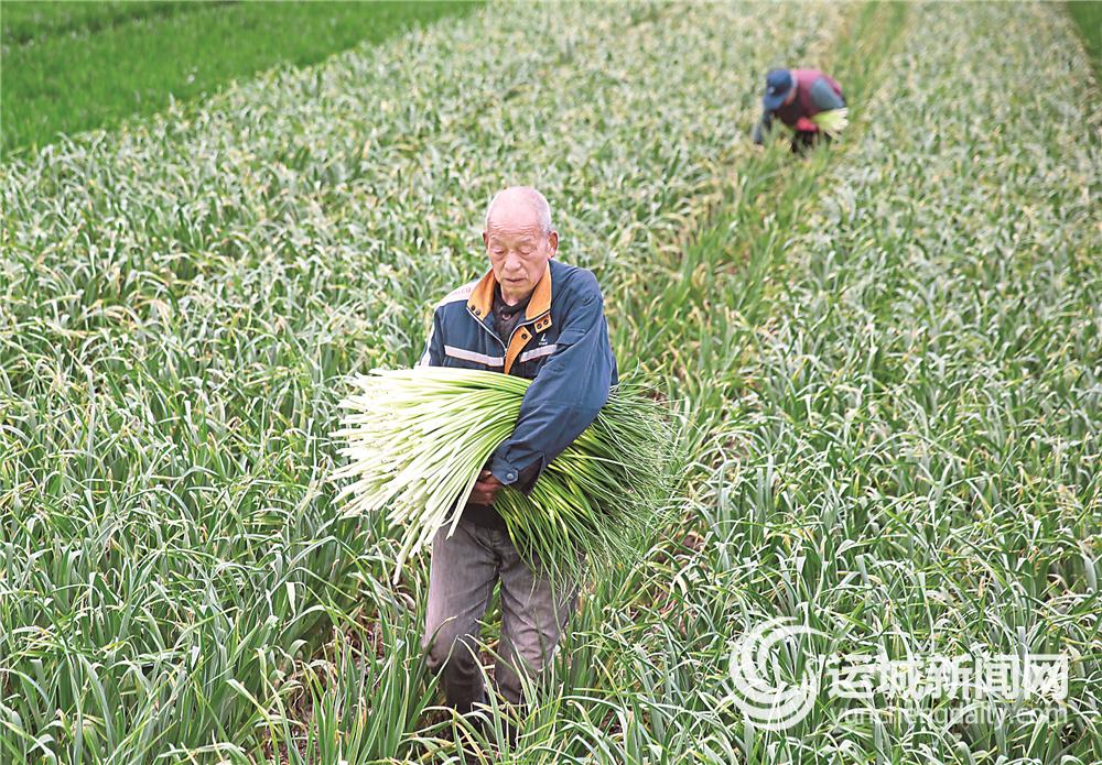 4月6日,永济市城东街道马铺头村村民在蒜田采收蒜薹。