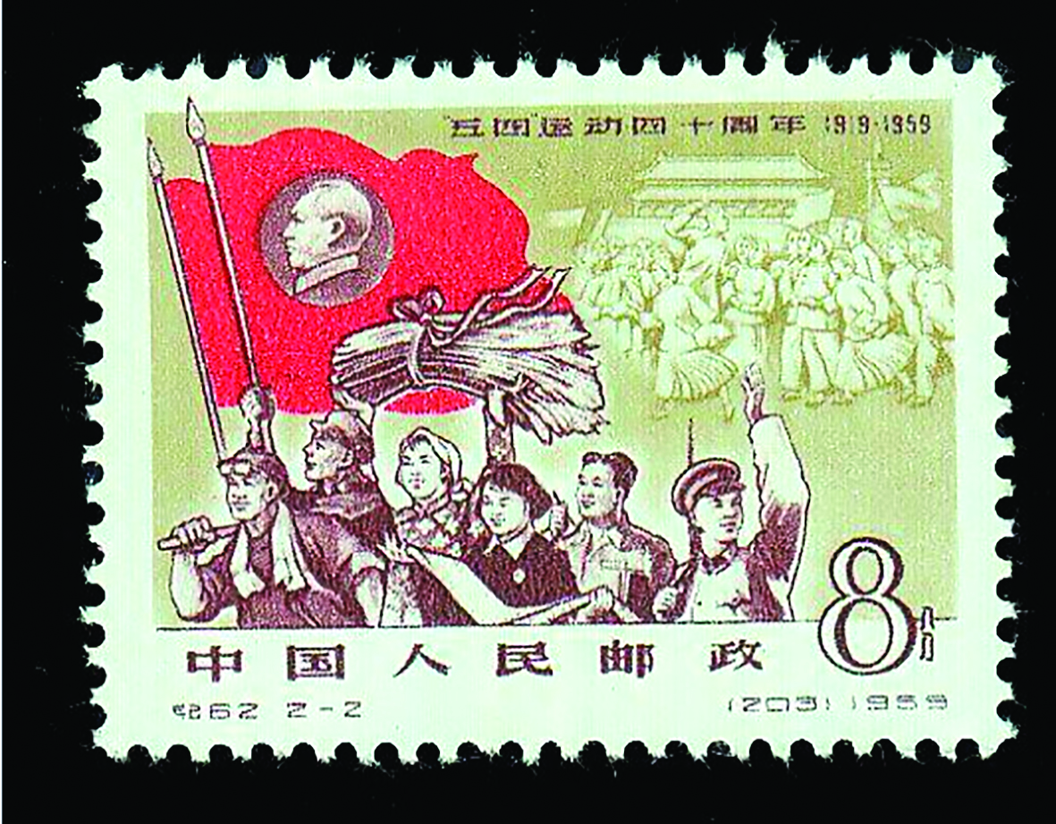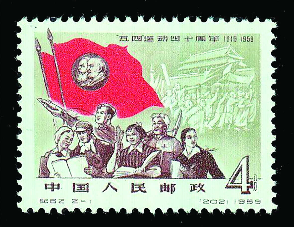 1959年7月1日,中国邮政发行《五四运动四十周年》纪念邮票一套两枚,志号为纪62。邮票图案名称分别为:《向科学技术进军》(2-1)、《工农商学兵》(2-2)。