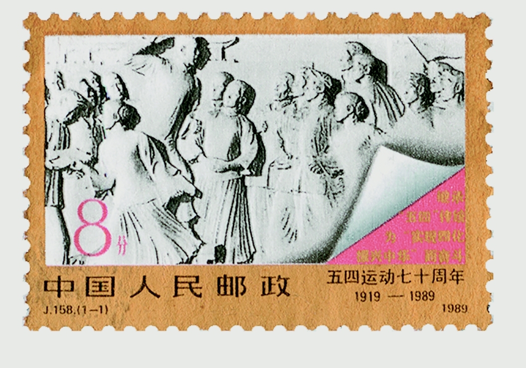 1989年5月4日,邮电部发行《五四运动七十周年》纪念邮票一套一枚。志号为J158。邮票主图为“五四运动”浮雕。
