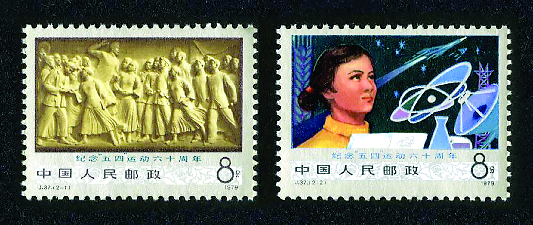 1979年5月4日,中国邮政发行《纪念五四运动六十周年》纪念邮票一套两枚,志号为J37。邮票主图名称分别为:《发扬“五四”光荣传统》(2-1)、《为伟大的新长征贡献青春》(2-2)。
