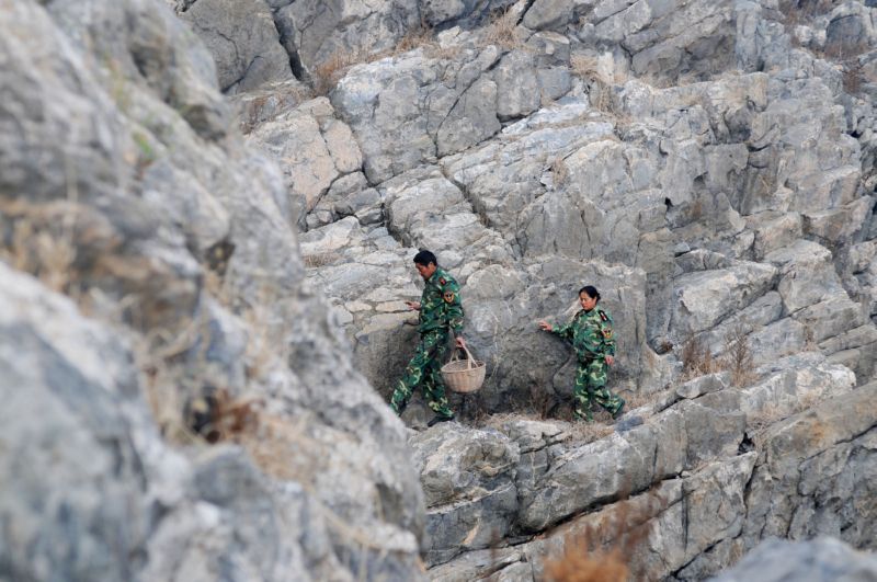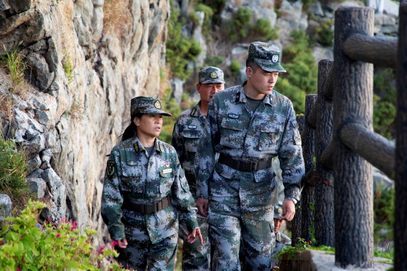 ▲在江苏省连云港市灌云县开山岛,王仕花(左)、民兵哨所所长陈志显(右)和轮值民兵一起巡逻(2020年9月27日摄)。 新华社记者 刘芳 摄
