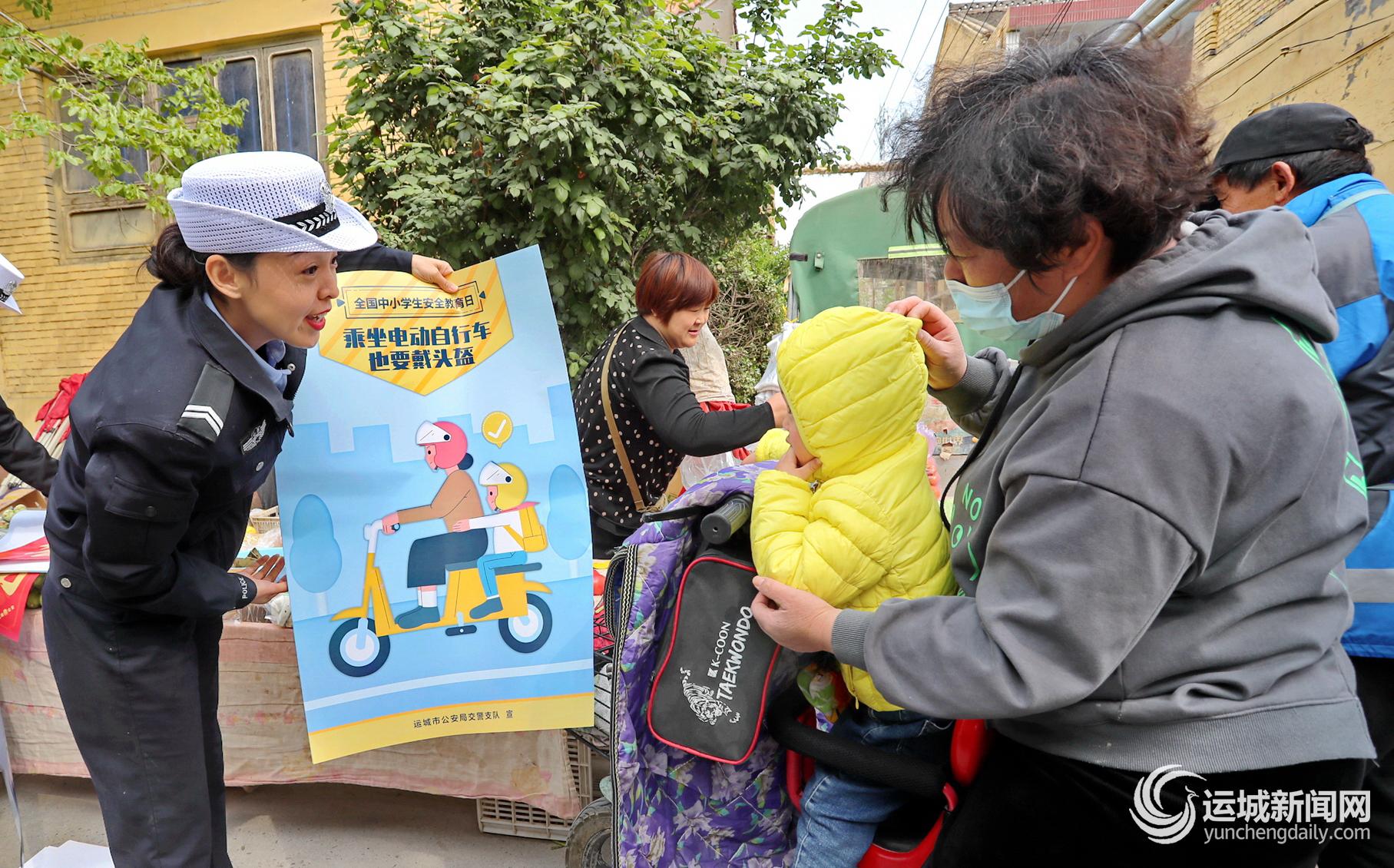 ▲4月9日,盐湖交警大队宣传科民警,在大渠办西留村集市上开展“一盔一带”“一老一小”交通安全宣传。