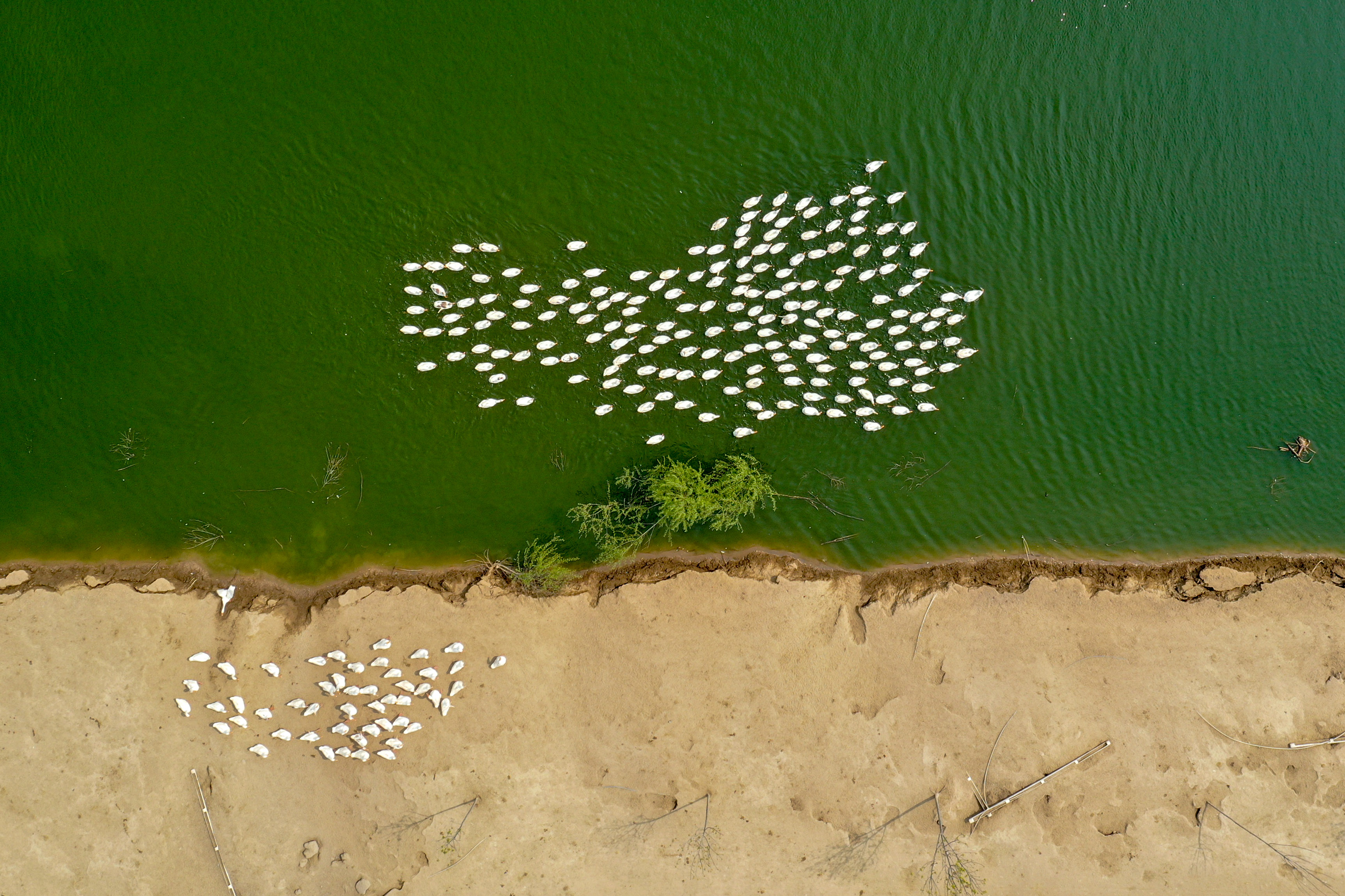 4月9日,白鹅在新市镇花谷核心区河道觅食(无人机照片)。