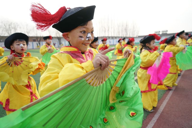 ▲2019年12月19日,河北省滦州市小闫营小学学生在排练地秧歌。国家级非遗地秧歌是冀东地区广为流传的一种民间艺术。 新华社记者 牟宇 摄
