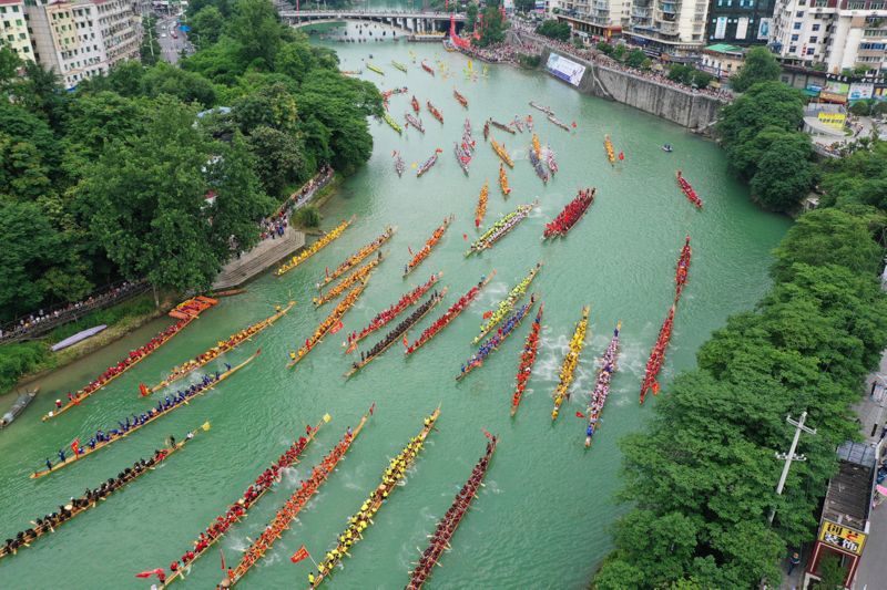 ▲2019年6月5日,人们在贵州省铜仁市碧江区锦江河上参加龙舟巡游活动,迎接端午节的到来(无人机照片)。 新华社发