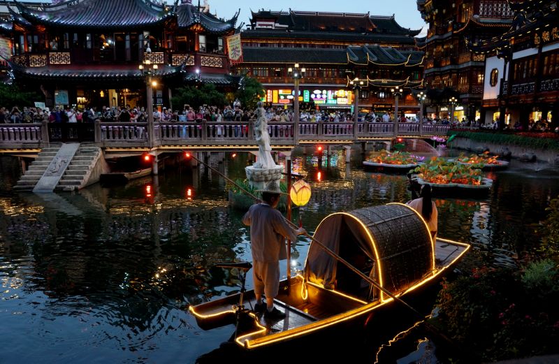 ▲这是2020年6月6日拍摄的上海豫园九曲桥湖面上的演出。当日,首届上海夜生活节正式拉开帷幕,围绕夜购、夜食、夜游等主题,推出上海酒吧节、深夜食堂节、深夜书店节、购物不眠夜等180余项特色活动。 新华社记者 刘颖 摄