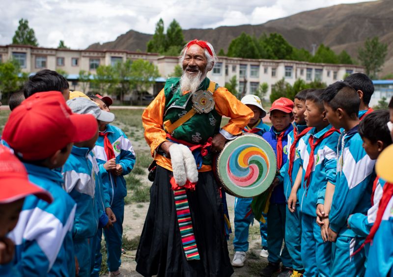 ▲2020年7月2日,在西藏山南市琼结县下水乡小学,国家级非物质文化遗产“久河卓舞”传承人尼玛(中)进行教学表演前的准备工作。 新华社记者 普布扎西 摄
