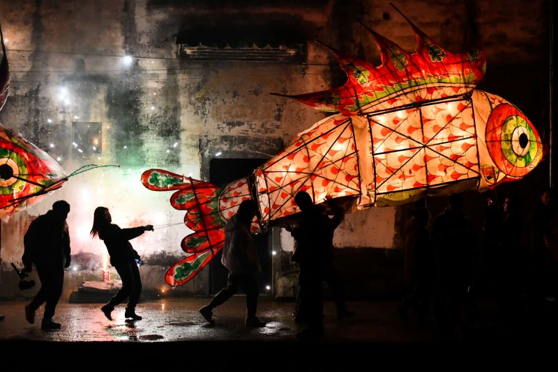 ▲2021年2月26日是农历正月十五元宵节,在安徽省黄山市歙县溪头镇汪满田村,游客和村民嬉鱼灯,闹元宵。 新华社记者 韩旭 摄
