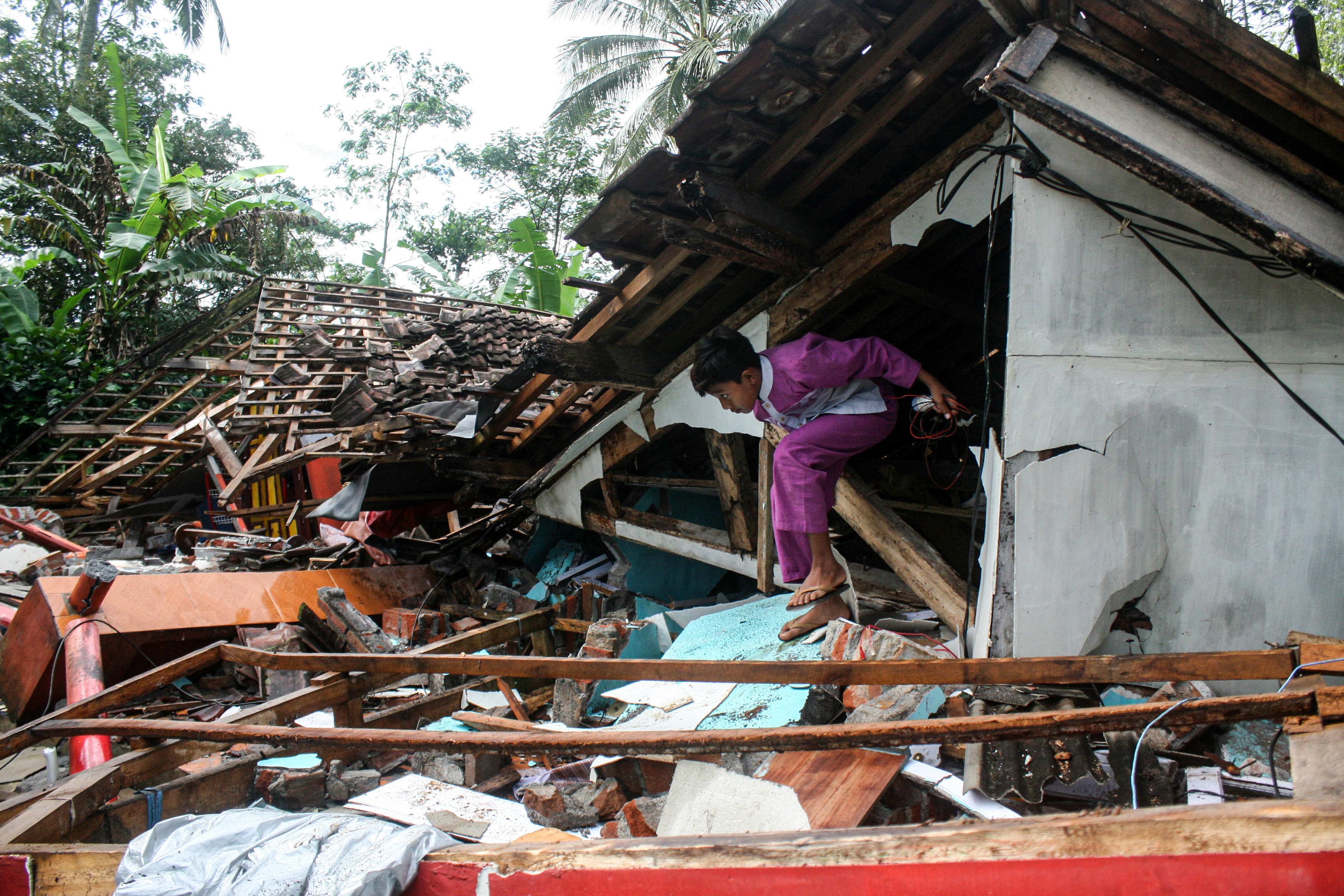 ▲4月11日,一名男孩在印度尼西亚东爪哇省卢马姜一个村庄查看震后废墟。印度尼西亚抗灾署官员10日确认,印尼东爪哇省南部海域当天下午发生的6.1级地震已造成6人死亡、1人重伤。 本栏图片均据新华社