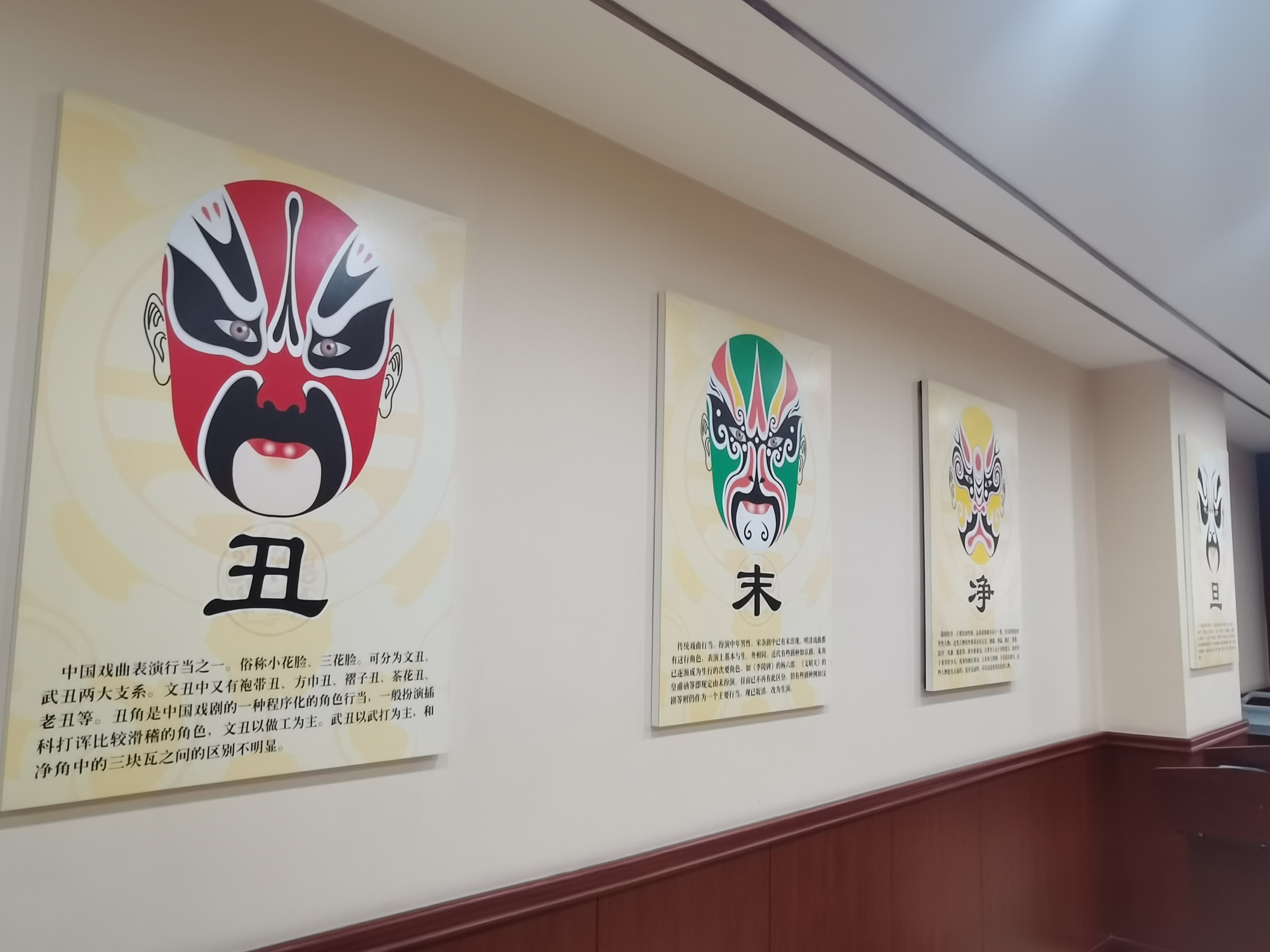 在二楼入口墙壁上,挂的是戏剧五大行当:生旦净末丑脸谱。令人赞叹的是,颇具匠心的柴斌在洗手间的标识上也用的是戏剧脸谱。动漫的美女戏剧脸谱和英雄戏剧脸谱,让人看后忍俊不禁,觉得既轻松又俏皮。