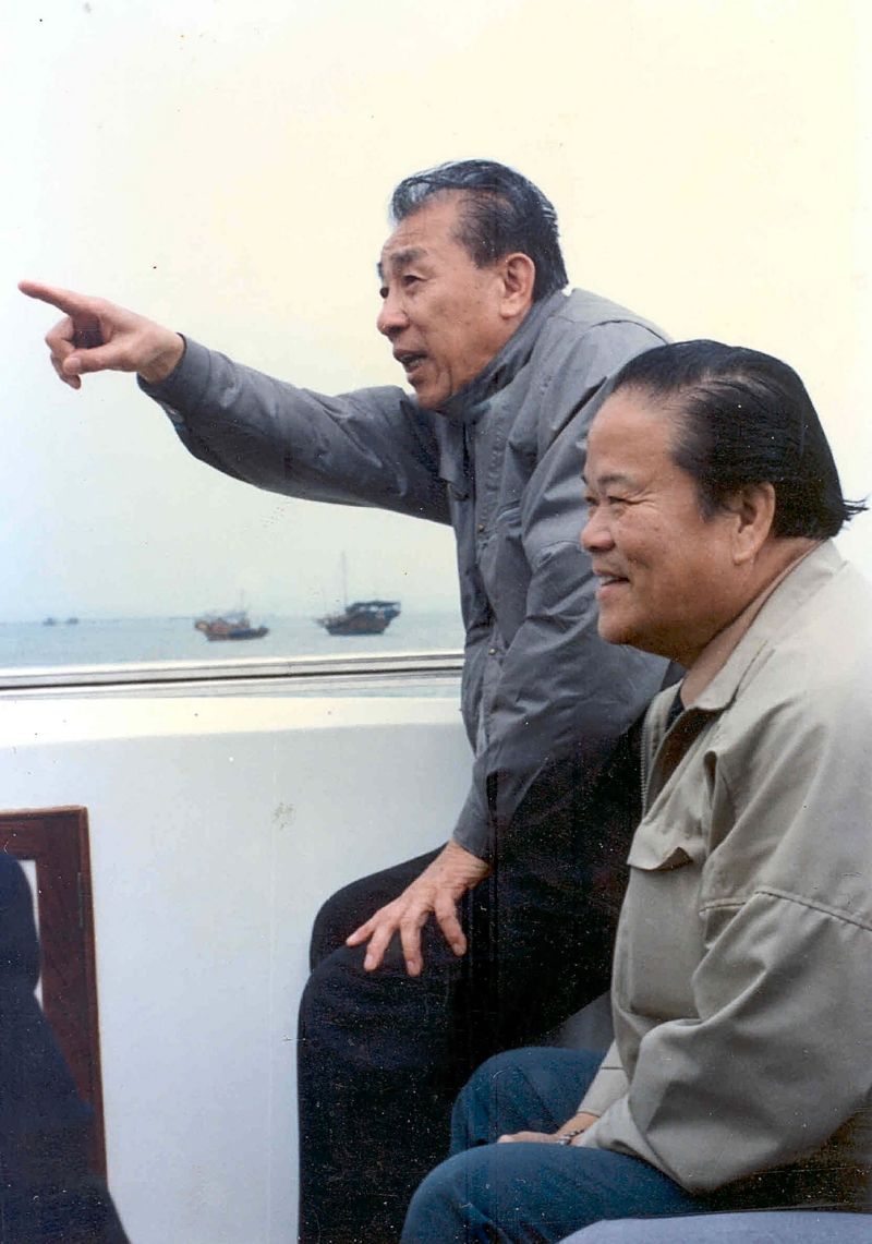 1980年袁庚(左)在海上考察蛇口(资料照片) 新华社发