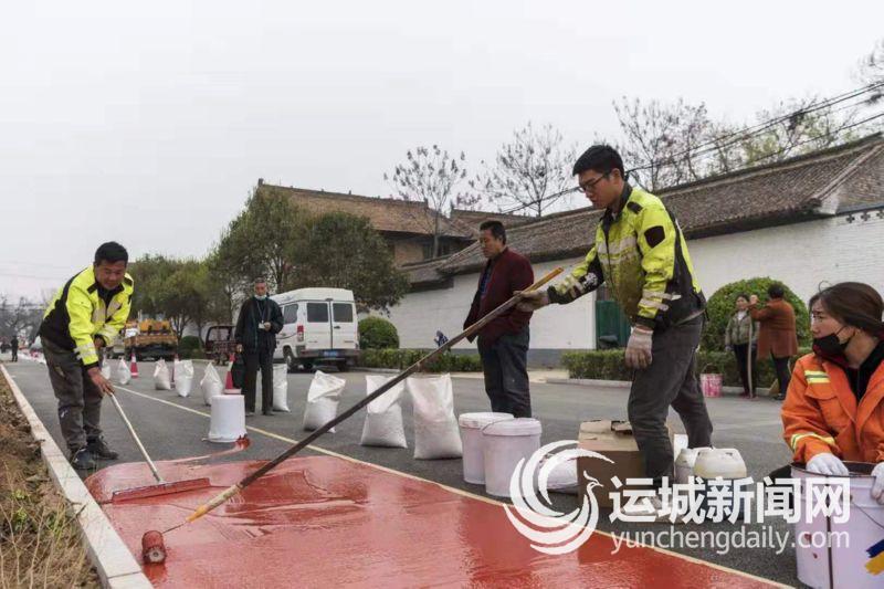 4月7日,工人在芮城县南磑镇大禹渡村铺设彩色人行道。