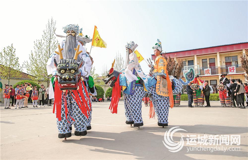 4月8日,稷山县清河镇阳城学校的操场上,几名小学生盛装出演国家级非遗文化——高跷走兽。