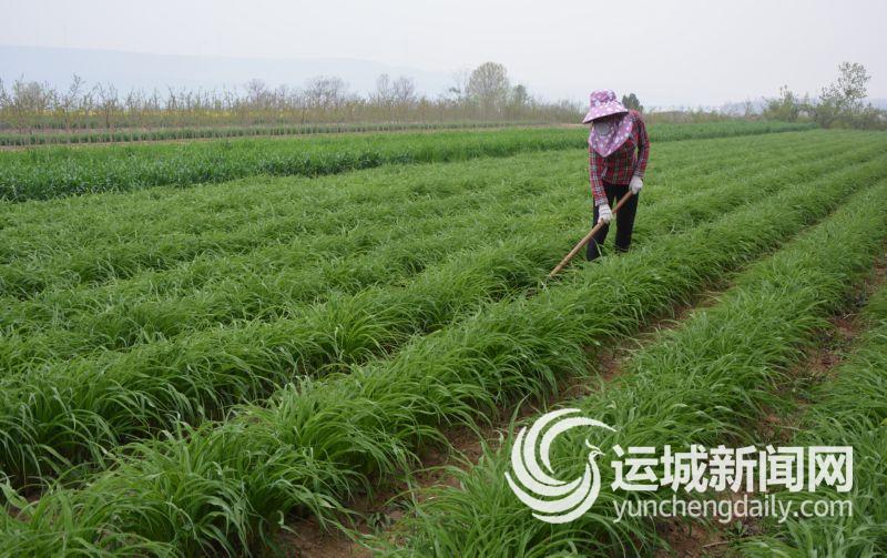 4月10日,芮城县风陵渡镇涧口村村民在黄花菜田里锄草。