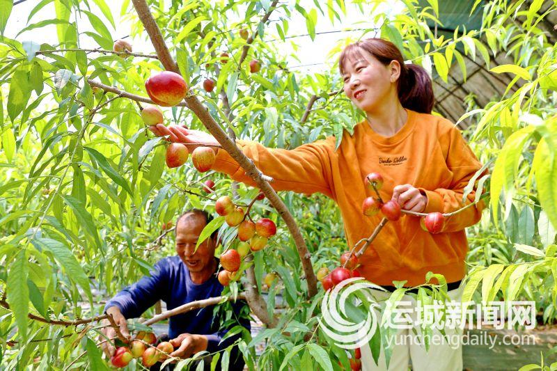 4月12日,夏县瑶峰镇下埝底村村民在观察油桃着色情况。