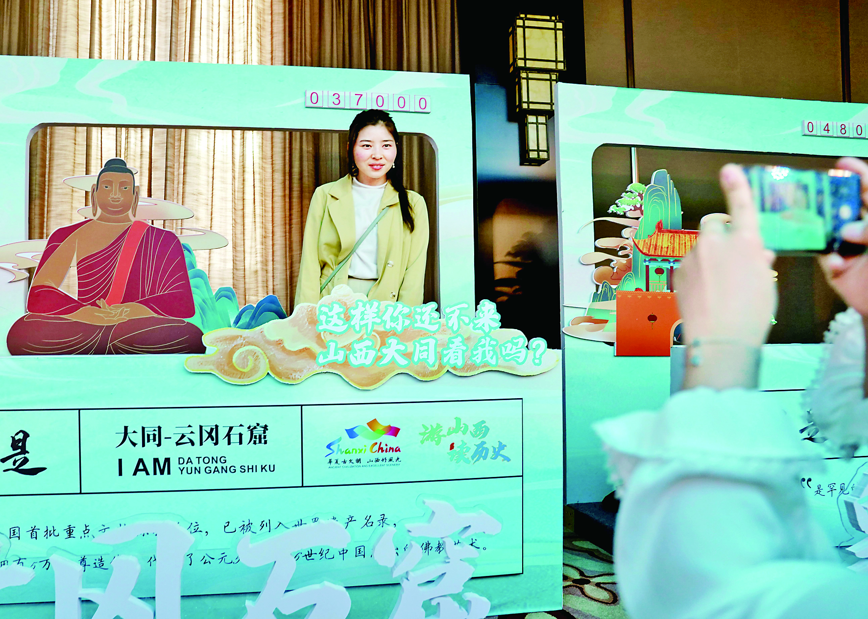 参加推介活动的上海市民在云冈石窟的“打卡墙”前留影