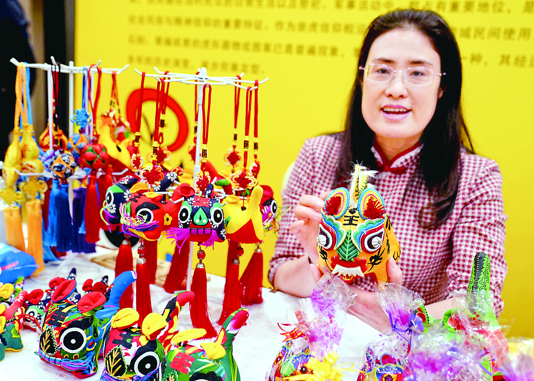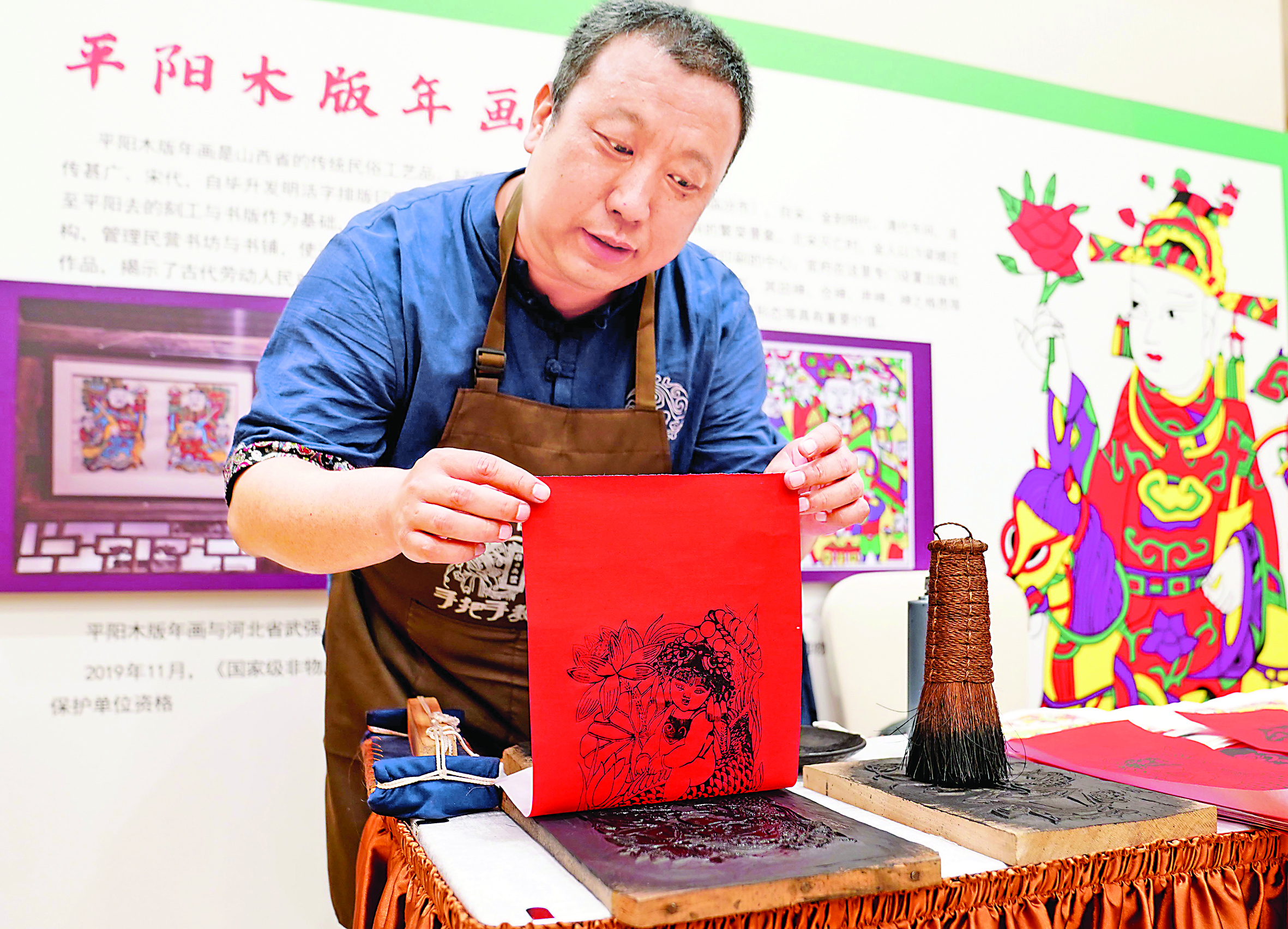 4月17日,工作人员在活动现场展示非遗项目木版年画