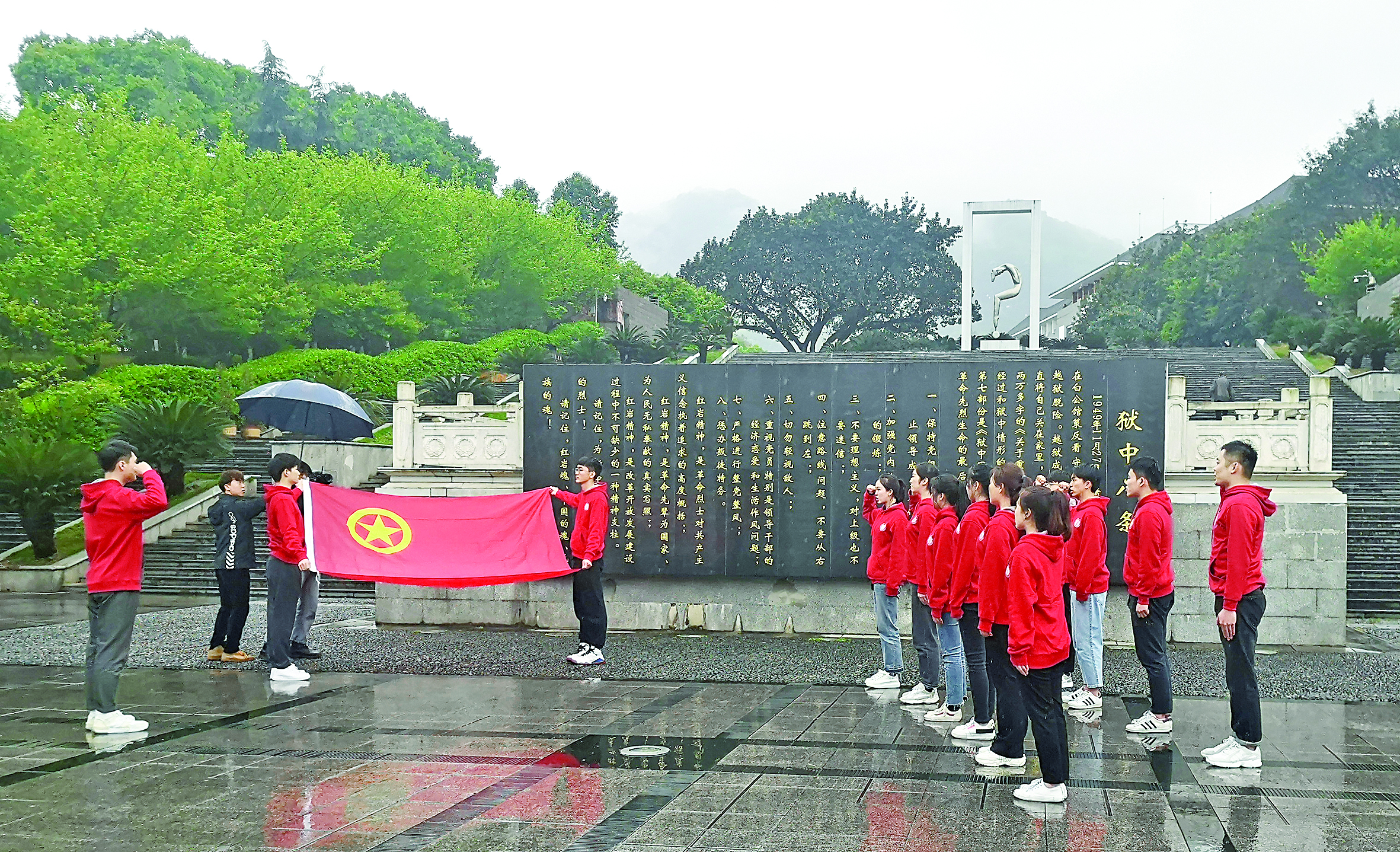 西南大学学生在“狱中八条”纪念墙前对团旗宣誓(资料照片) 新华社发