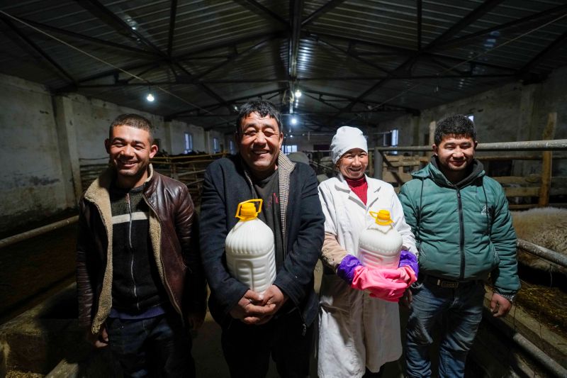 ▲在新疆和田皮山县阔什塔格镇加依纳古特村,布威萨热·阿卜杜杰力(右二)等展示收获的驴奶(2月4日摄)。 新华社记者 赵戈 摄