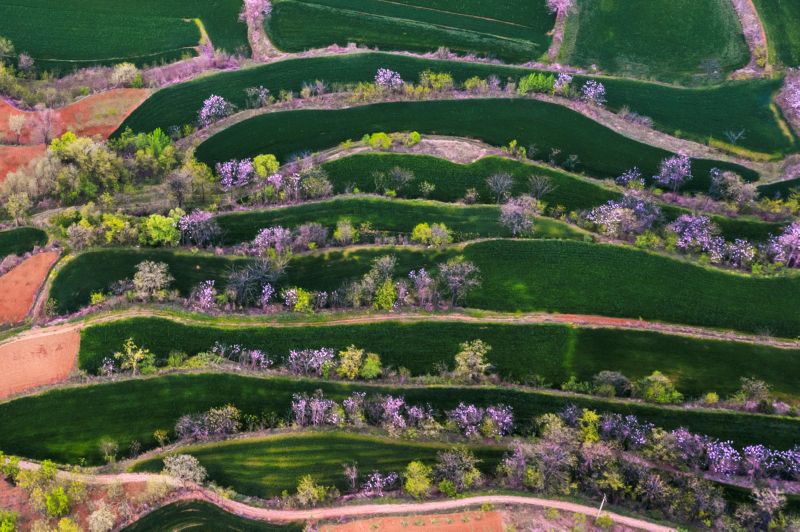 看那麦田碧绿好像海浪翻滚,泡桐花开又如紫衣飘飘,层层梯田形态多样丰富,大路小道绵延通向村庄,沟沟壑壑让人流连忘返。 郭改梅 摄