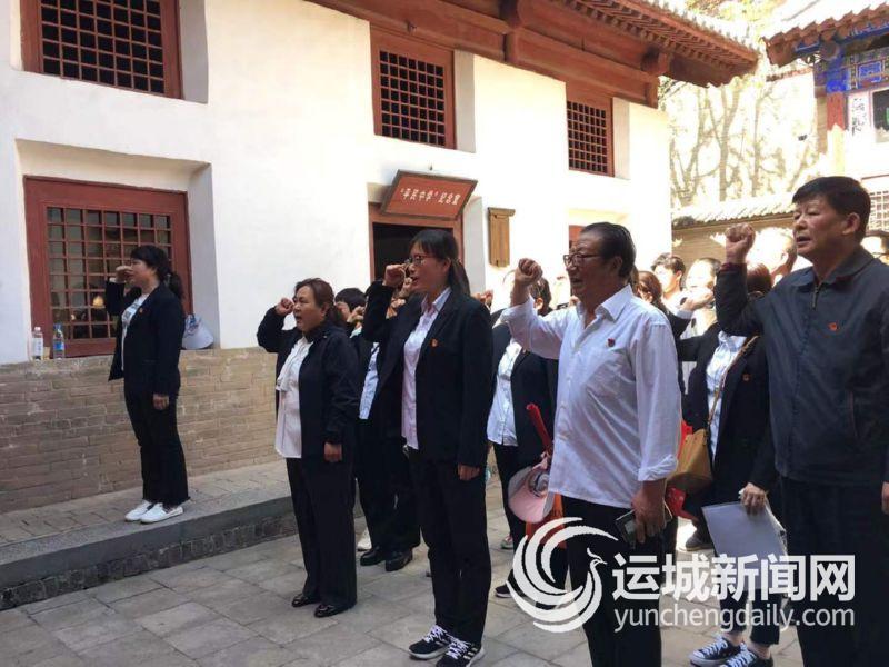 堆云洞位于夏县水头镇,1928年中共河东特委在这里成立,并在这里秘密活动长达十年,故此处堪称晋南革命的摇篮。在讲解员的带领下,全体人员参观了河东特委展馆、嘉康杰展厅、黎明前曙光展厅等,聆听老一代革命先烈的英雄事迹,重温革命先烈的奋斗史,瞻仰中共河东特委成立时的工作场所,回顾当年峥嵘岁月。随后,全体党员列队肃立,重温入党誓词(上图),同唱革命歌曲。