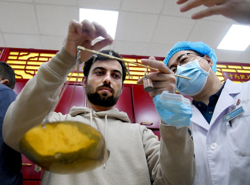 ▲4月23日,在青岛西海岸新区中医医院国际学生中医药文化体验基地,来自中国石油大学(华东)的留学生在药房医师的指导下对药材进行称重。