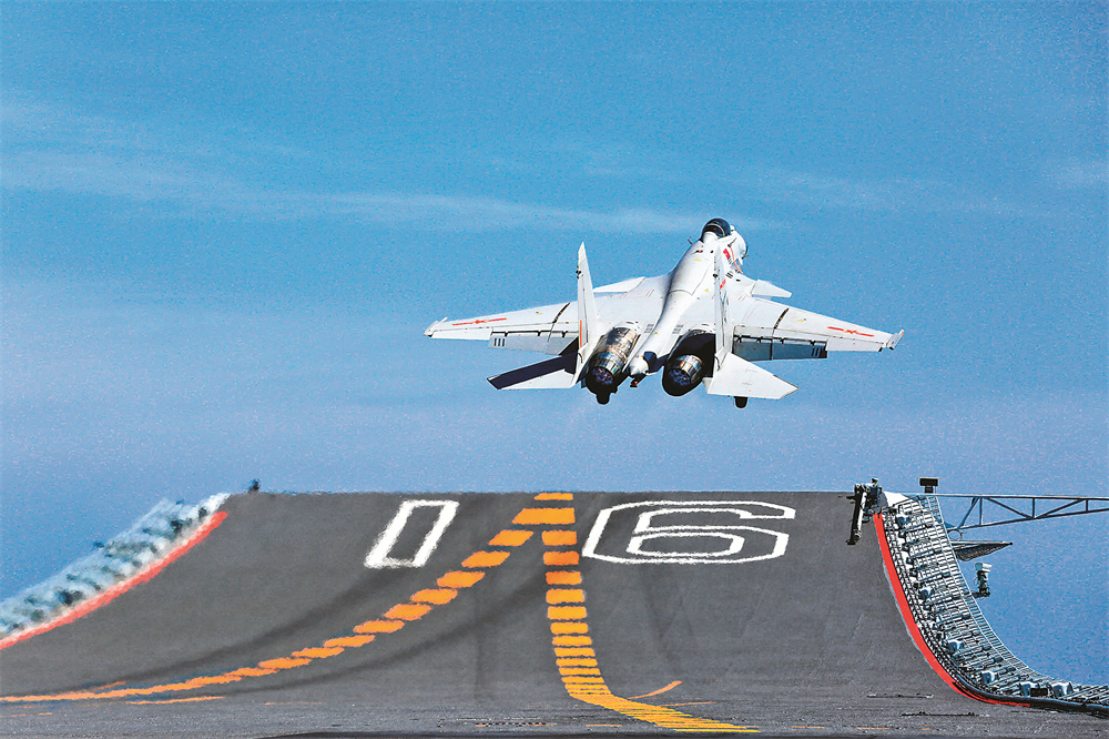 2017年7月1日,一架歼-15舰载战斗机从辽宁舰滑跃起飞。 新华社发 曾 涛 摄