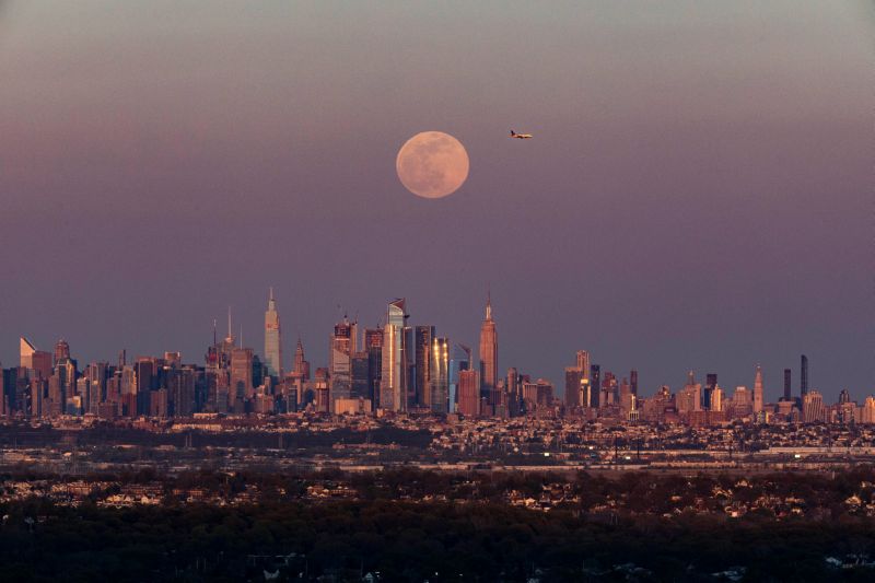 ▲4月26日,“超级月亮”从美国纽约曼哈顿的天际线上升起。“超级月亮”指的是月亮位于近地点附近时刚好出现满月。