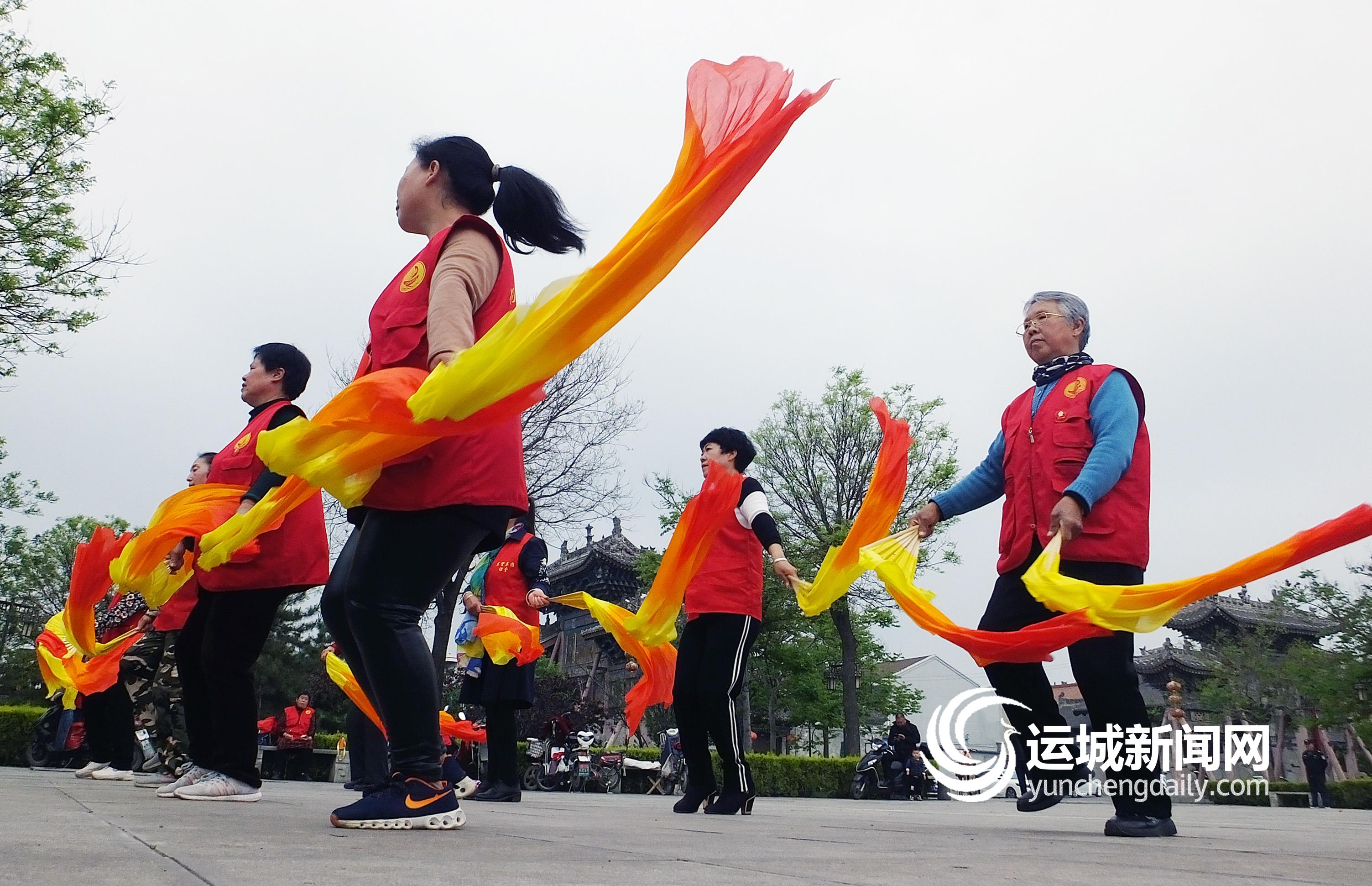 4月26日,新绛县卧龙居小区志愿者团队的志愿者翩翩起舞,加紧排练扇舞《火红的日子》。