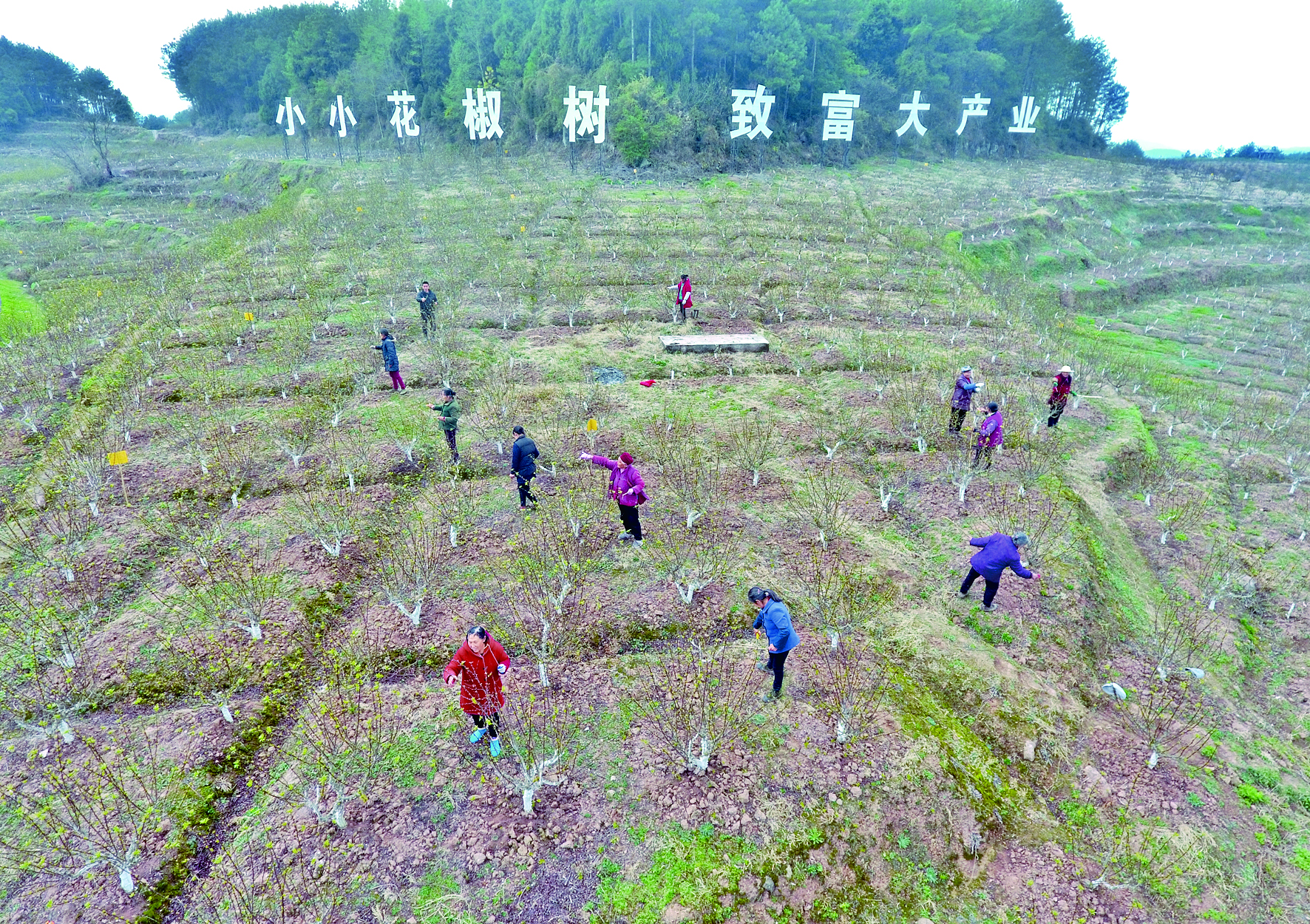 3月3日,在巴中市平昌县土兴镇,村民在青花椒主题公园内劳作(无人机照片)。 新华社记者 刘 坤 摄