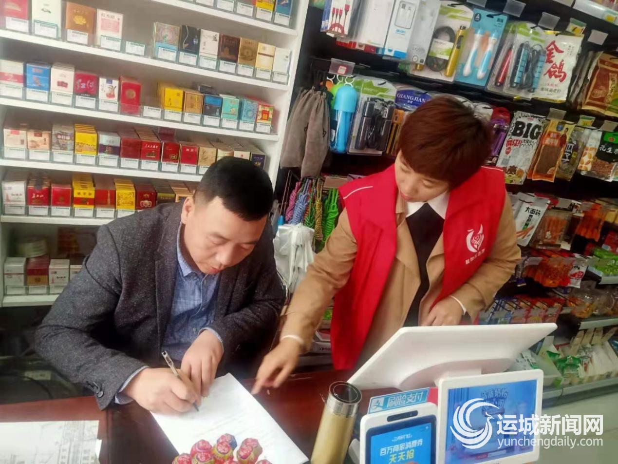 4月25日,盐湖区姚孟办天茂城社区的工作人员指导辖区商户签订消防安全责任书。