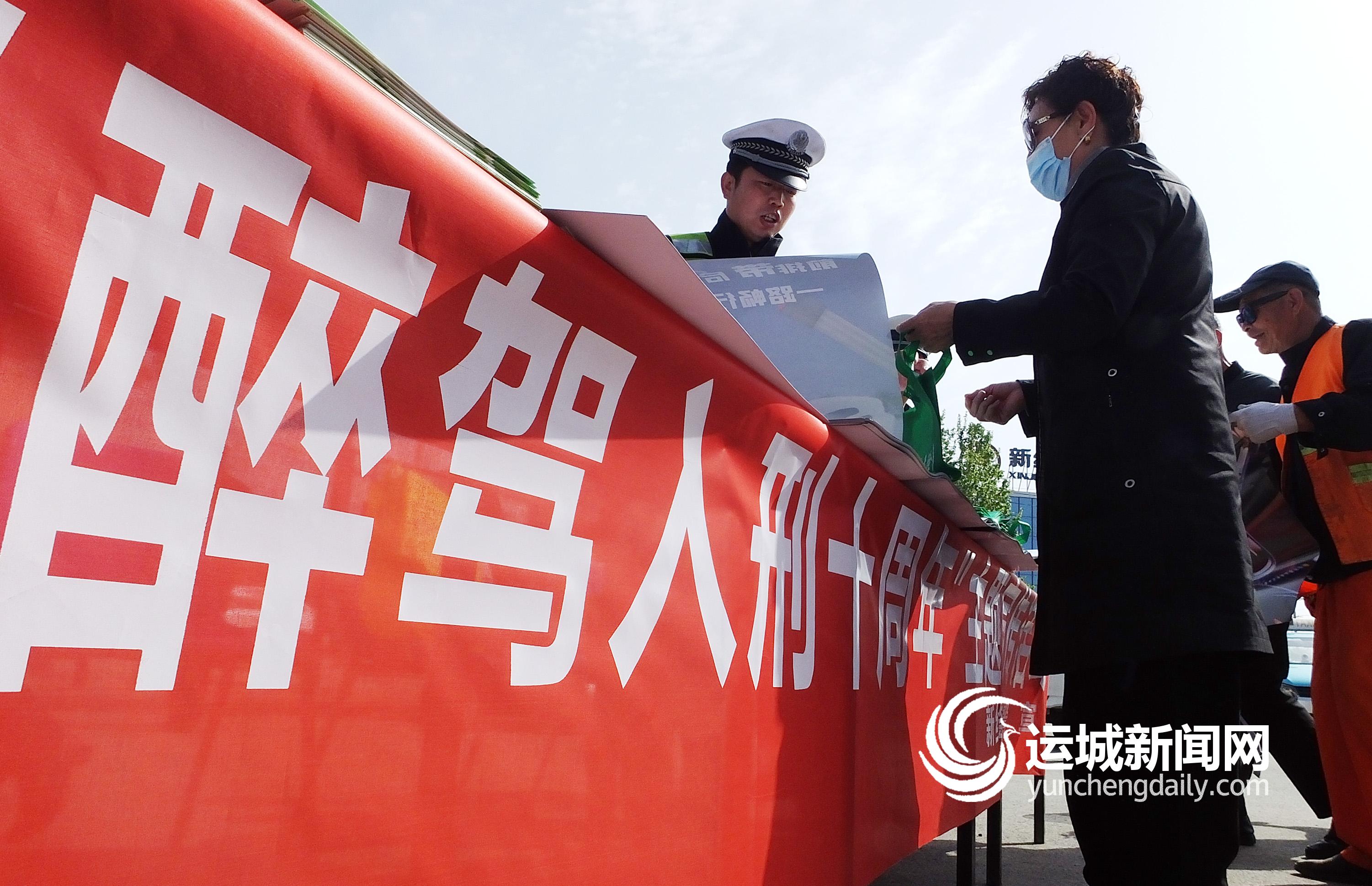 4月27日,在新绛县桥头广场,民警向群众宣传醉驾的危害性。
